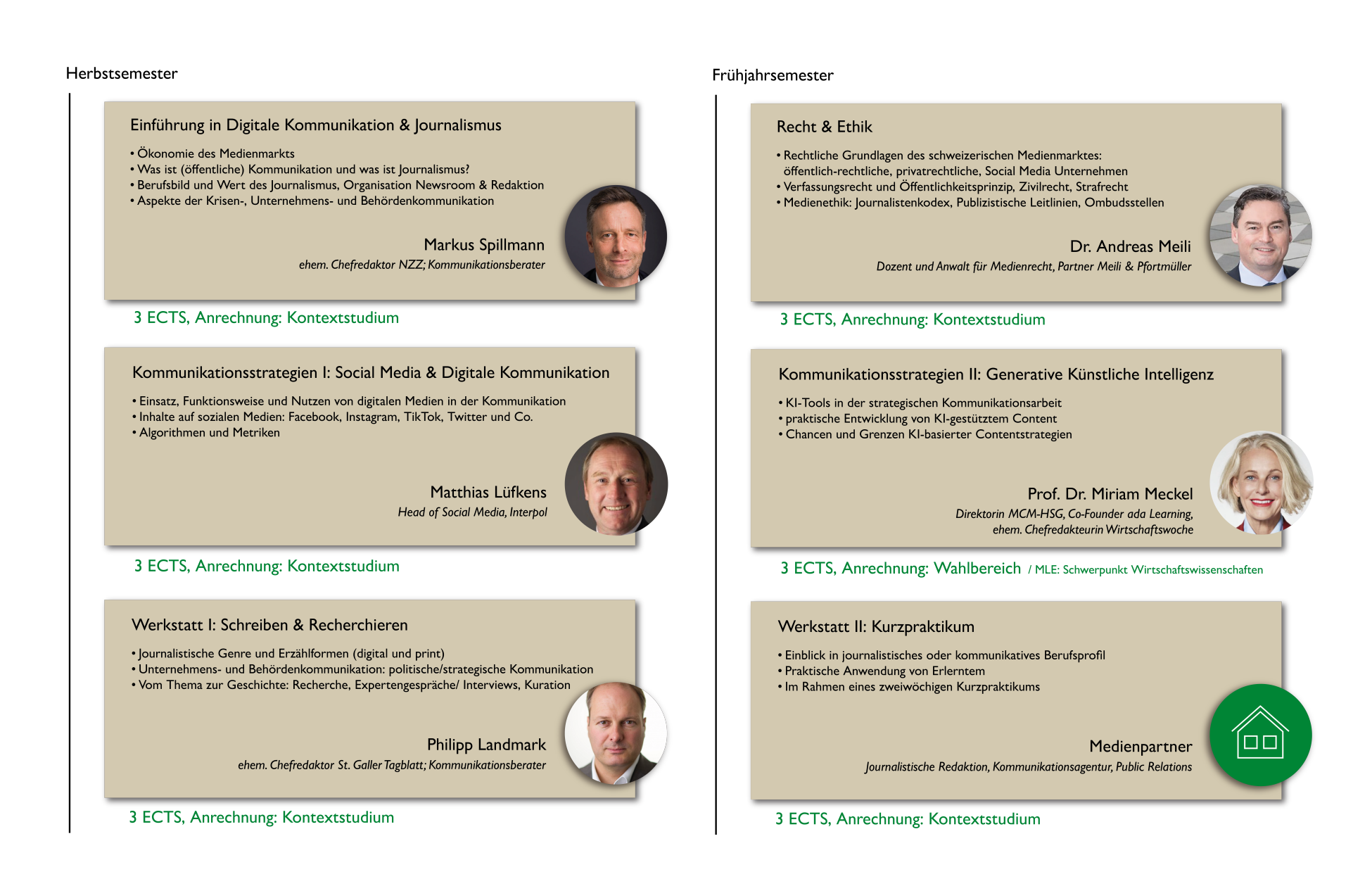 Das Lehrprogramm Digitale Kommunikation & Journalismus umfasst 18 der 90 ECTS des HSG-Master-Studiums, dauert zwei Semester und schliesst mit einem eigenen Zertifikat ab.