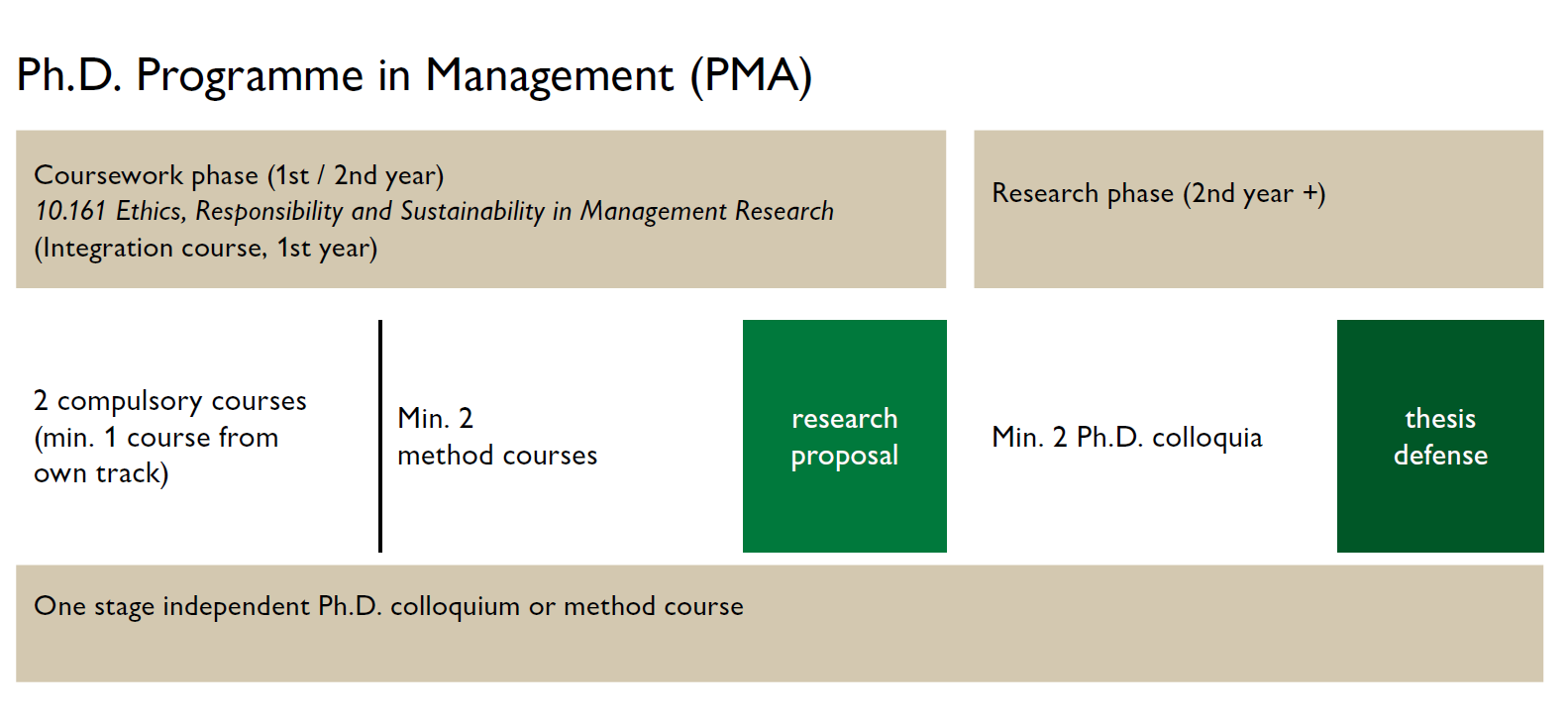 Das Ziel der Kursphase besteht darin, sowohl methodologische Fähigkeiten zu vertiefen als auch fachspezifisches Wissen zu vermitteln. Dementsprechend müssen zwei theoriegeleitete Pflichtkurse – davon mindestens einer aus der eigenen Vertiefung – und zwei Fach-/Methodenkurse abgelegt werden. Fach-/Methodenkursen können sowohl aus dem Kurscurriculum des PMA als auch dem der Global School in Empirical Research Methods (GSERM) gewählt werden. Zusätzlich muss im ersten Studienjahr – und somit im Rahmen der Kursphase – der Integrationskurs "10.161 Ethics, Responsibility, and Sustainability in Management Research" erfolgreich absolviert werden. Doktorierende schließen die Kursphase mit der Ausarbeitung der Vorstudie ab, die sie ihrem Dissertationskomitee vorlegen und anschliessend mündlich verteidigen müssen.