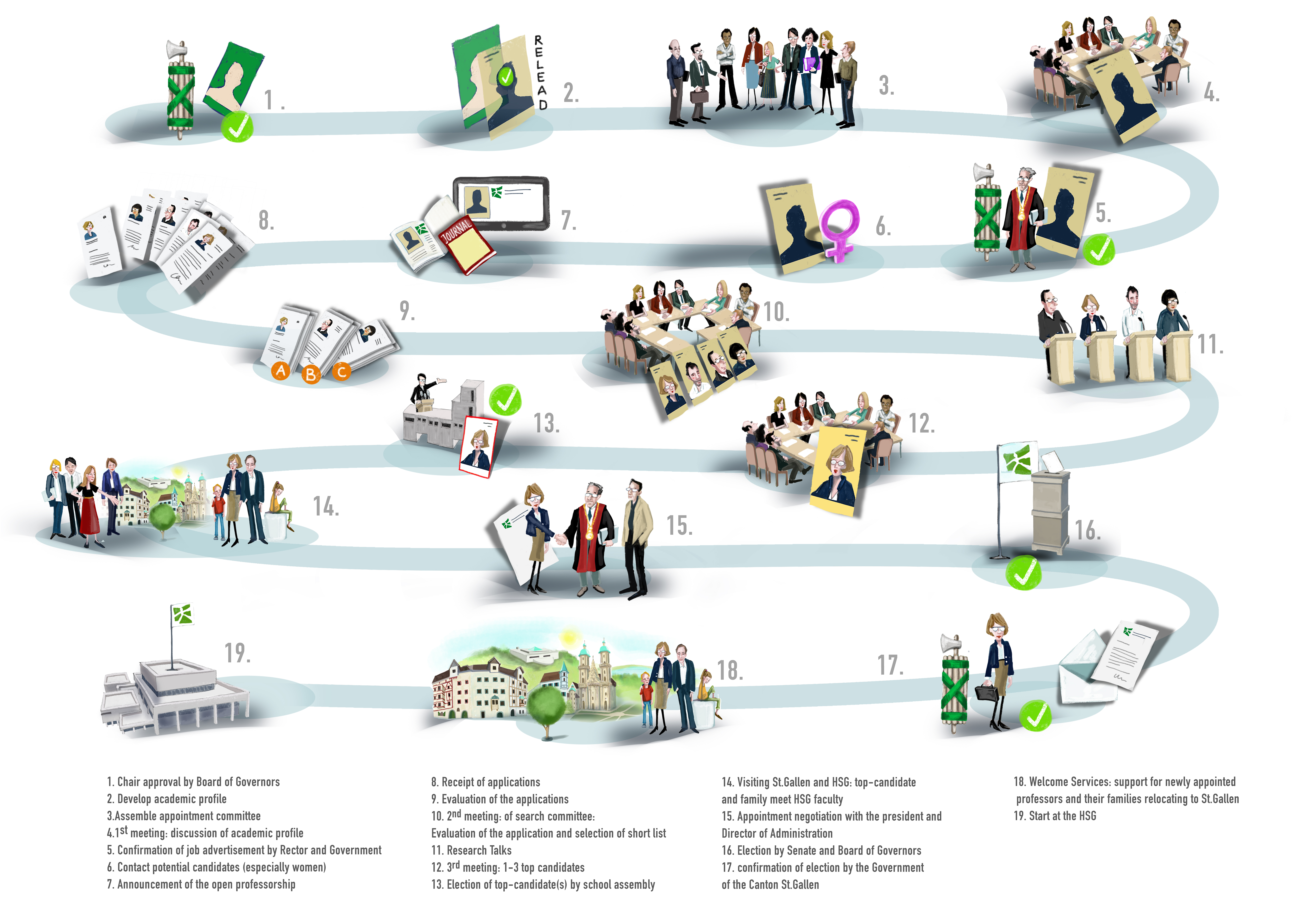 Hat sich die Abteilung (School) an ihrer Abteilungsversammlung für eine Kandidatin bzw. für einen Kandidaten entschieden, unterbreiten die Rektorin/der Rektor und die Verwaltungsdirektorin/der Verwaltungsdirektor der Kandidatin bzw. dem Kandidaten das Angebot der Universität St.Gallen im Rahmen des Berufungsgesprächs.