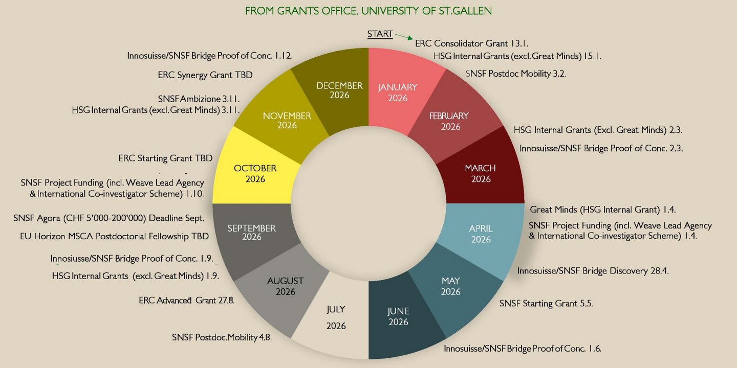 Die Förderlandschaft der Schweiz ist vielfältig. Wir führen hier die wichtigsten Einrichtungen, Programme, Fördermöglichkeiten sowie Möglichkeiten zur Recherche von aktuellen Ausschreibungen und Förderprogrammen auf. Das Team des Grants Office St.Gallen ist Ihnen gern bei der Suche nach einem geeigneten Förderprogramm für Ihr Projekt behilflich. Über aktuelle Ausschreibungen informieren wir ausserdem in unserem Newsletter. Unser unten stehender Förderungskalender dient als Erinnerung an zahlreiche wichtige Einreichungsfristen.