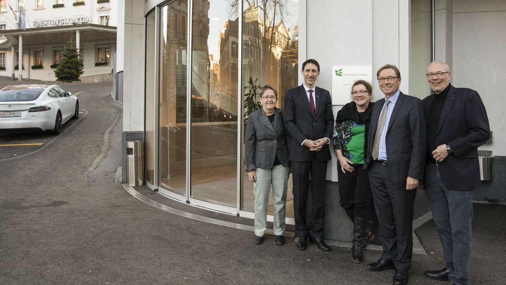 Bild: Einweihung des «Campus E» (von links nach rechts): Universitätsrätin Hildegard Fässler; Michael Vogt (General Manager Einstein St.Gallen); Prorektorin Ulrike Landfester; Prorektor Kuno Schedler; Martin Huser (Vizepräsident des Universitätsrates).