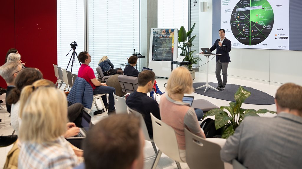 «Wir wollen heute Dozierende, Programmverantwortliche und weitere HSG-Mitarbeitende inspirieren und so unsere Lehre laufend verbessern», sagte Martin Eppler, Prorektor Lehre, in einem Gespräch am Rande der Veranstaltung. Es gebe Aktualitäten, die das Nachdenken über die Lehre beeinflussten, fügte Eppler an. «Diverse Studien zeigen, dass das Engagement von Studierenden schweizweit nach zwei Jahren Pandemie abgenommen hat.» Innovative Lehrformate seien nun unter anderem wichtig, um die Studierenden zu aktivieren. «Der SQUARE ist für die HSG eine Chance, weil er viele Möglichkeiten für neue Formate bietet.» Eppler begrüsste mit einem kurzen Referat die Anwesenden und sagte darin: «Die Lehre verändert sich auch an der HSG gerade stark.» Als Beispiel nannte er unter anderem das «Personality in Residence»-Format. Bei diesem treten externe Persönlichkeiten aus Wirtschaft, Kultur, Wissenschaft und Politik mit der SQUARE-Community in den Austausch.