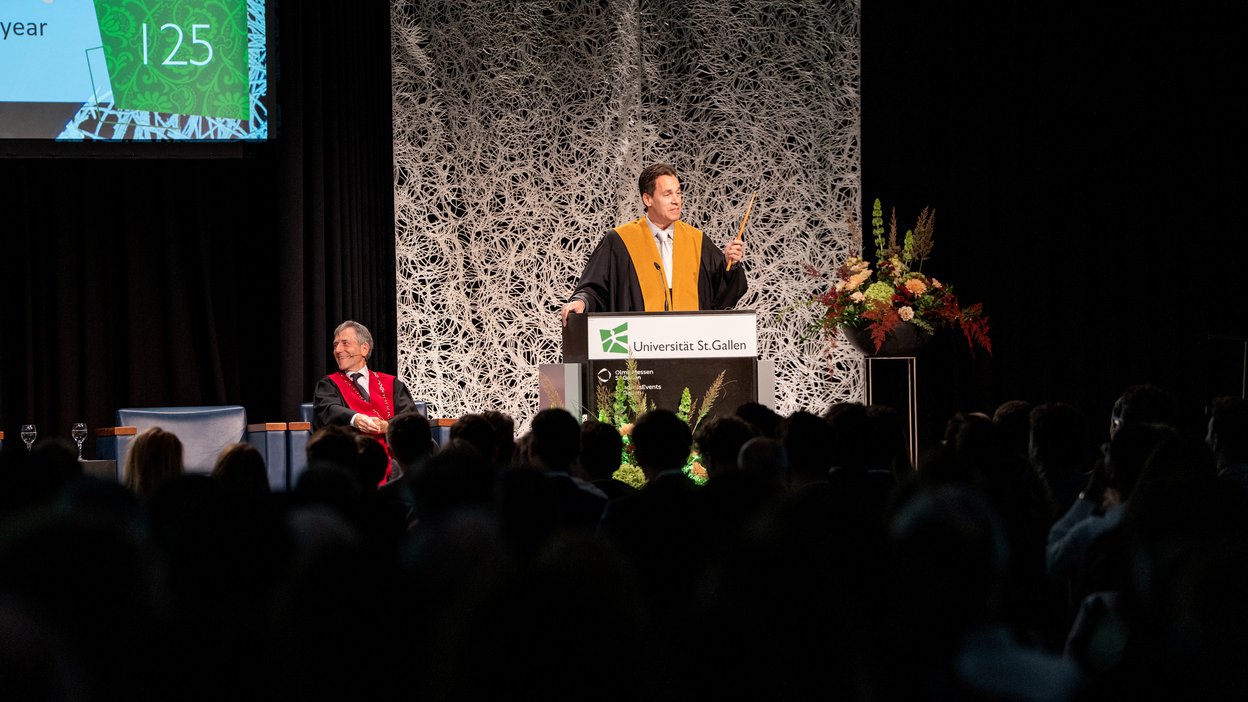 Den Absolventinnen und Absolventen gratulierte Prof. Dr. Martin Eppler, Prorektor Studium & Lehre. Der Titel seiner Rede hiess «Rhythmus im Leben». Der Prorektor verpackte 7 Lektionen für die neuen Lebensabschnitte der Graduierten nach ihrem Bachelorabschluss in 7 Beats und brachte den Anwesenden die Metapher des Schlagzeugspielens für ein erfolgreiches Leben näher. Denn wie schon der Philosoph Friedrich Nietzsche sagte: «Ohne Musik wäre das Leben ein Irrtum.»
