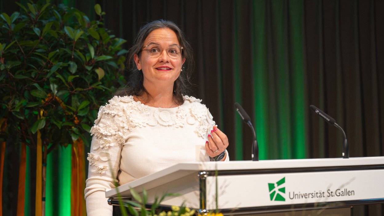Die Festrede hielt HSG-Alumna Dr. Melanie Oschlies, Global Head of Strategy Development bei Siemens Smart Infrastructure. Sie teilte mit den Doktorierten ihre persönliche Erkenntnis, wie wichtig es sei, ‘in a world of wisdom’ dennoch den eigenen Weg zu gehen. «Wenn Sie das nächste Kapitel Ihres Lebens beginnen, werden Sie eine Fülle von Ratschlägen und Hinweisen von Mentor:innen, Kolleg:innen, Freunden, Familienmitgliedern und Experten erhalten. Auch wenn diese Weisheit eine unschätzbare Unterstützung darstellt, ist es wichtig, sich daran zu erinnern, dass der Weg, den Sie bereits eingeschlagen haben und den Sie weiterhin selbst gestalten werden, einzig und allein Ihr eigener ist», betonte Melanie Oschlies.