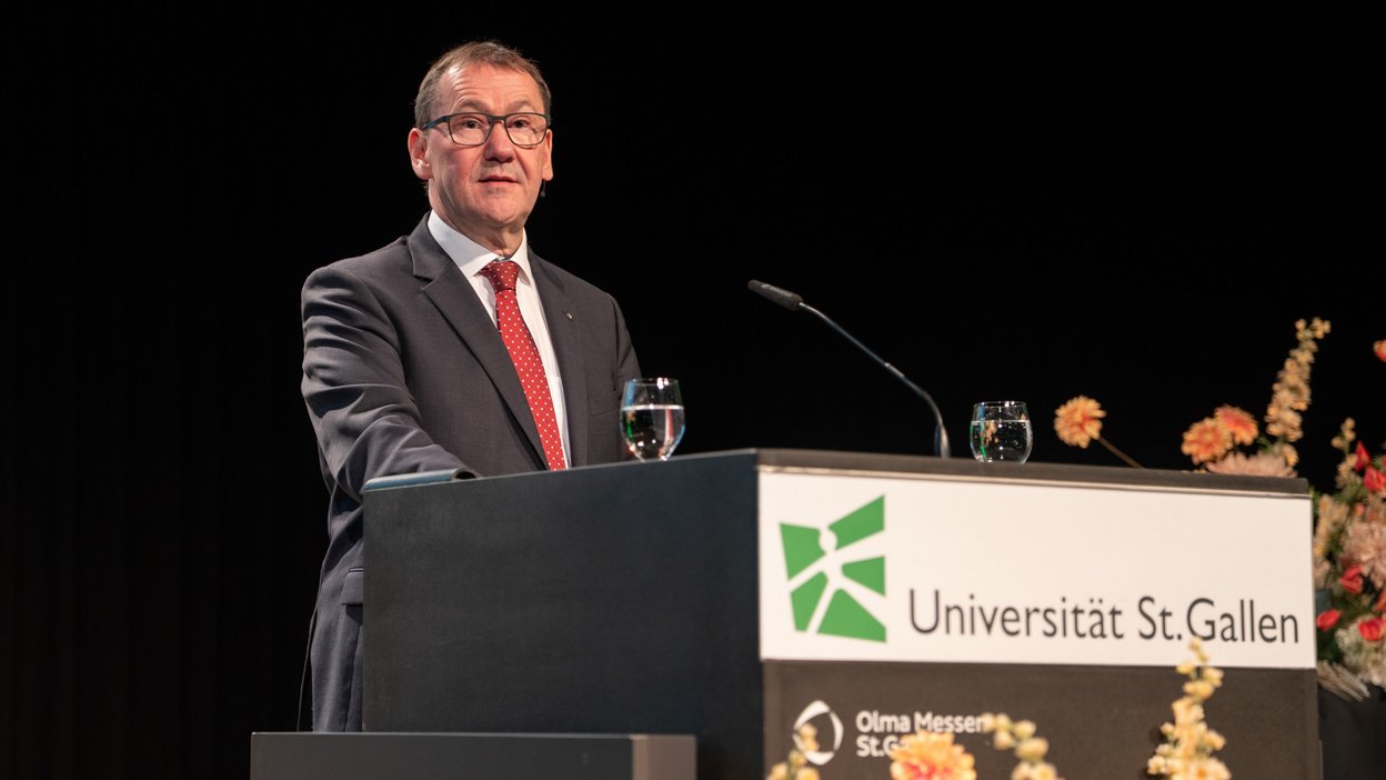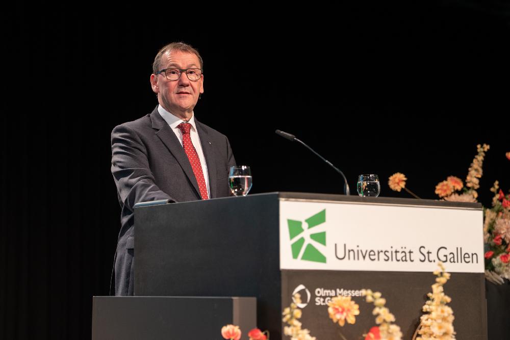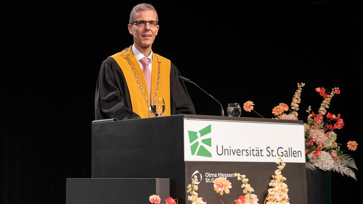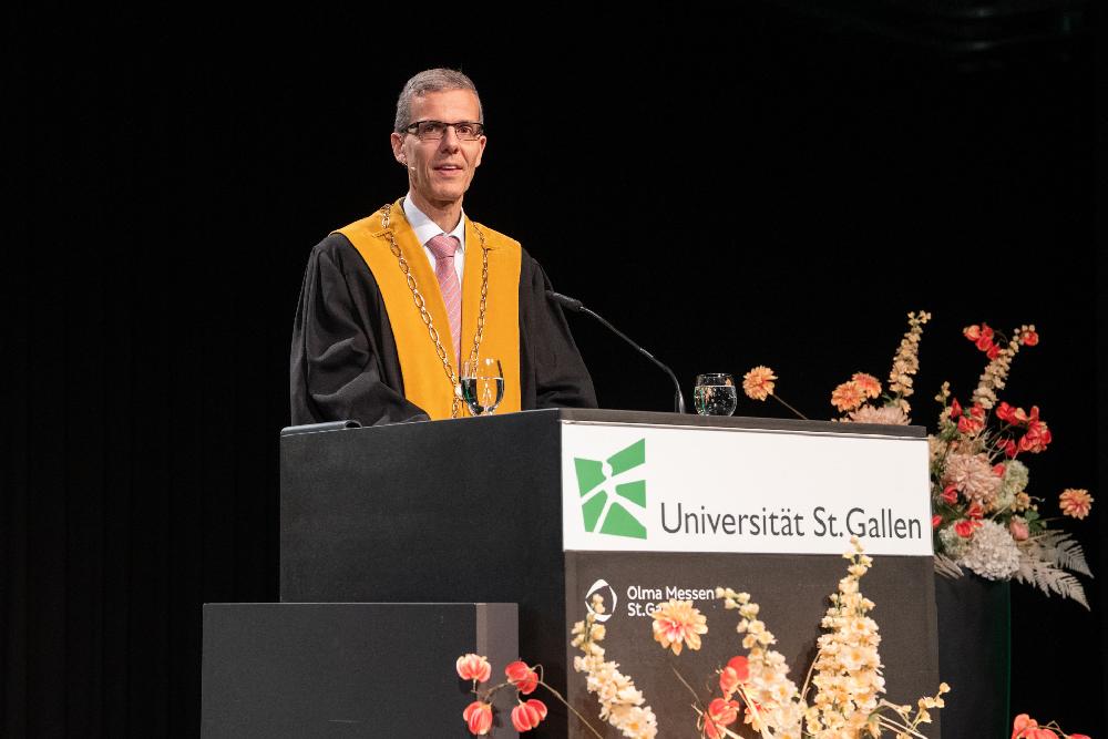 Rektor Manuel Ammann thematisierte in seiner Ansprache die aktuellen Unsicherheiten in der Welt. «Das Ende der regelbasierten internationalen Ordnung, das Ende der längsten Periode relativen Friedens in Europa, das Ende von wirtschaftlicher Verlässlichkeit – vieles, was lange als stabil galt, wirkt plötzlich fragil», sagte er. Gleichzeitig schreite die technologische Entwicklung immer schneller voran.