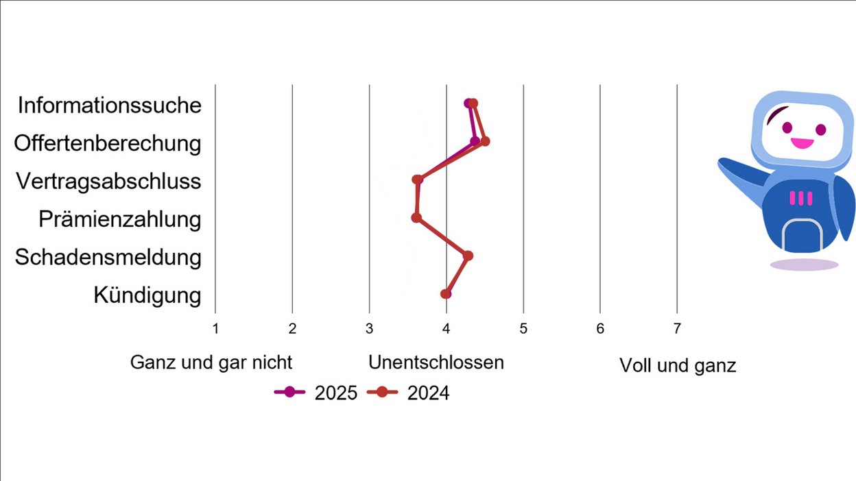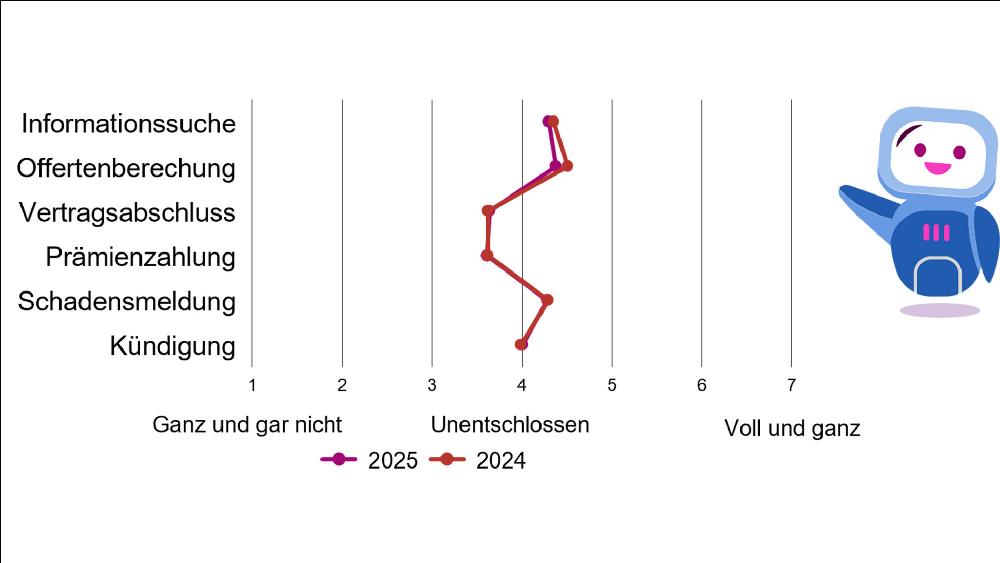 Die Daten für 2025 bestätigen den Trend zu digitalen Kanälen. Besonders in der Krankenversicherung erfolgen Informationssuche, Angebotserstellung und Schadensbearbeitung zunehmend online. Seit Einführung des jährlichen sogenannten Customer Journey Trackings (2022) zeigt sich ein unhaltender Wechsel zu digitalen Diensten, die Studienautoren sprechen von einem «Online-Shift». Vor allem bei jüngeren und urbanen Zielgruppen sind diese Anwendungen beliebt.