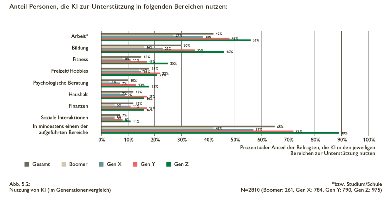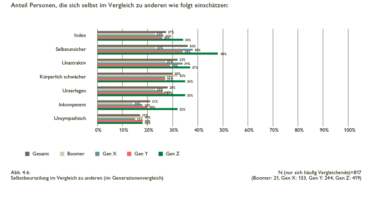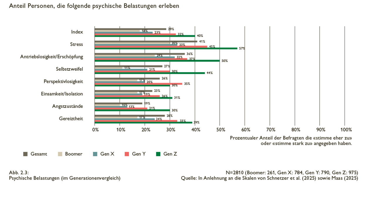 Viele junge Menschen erleben zurzeit psychische Belastungen nicht als Randerscheinung, sondern als prägendes Element ihres Alltags und ihres allgemeinen Lebensgefühls: Besonders Stress, Antriebslosigkeit und Selbstzweifel liegen in der Gen Z signifikant über den Werten älterer Altersgruppen. Zugleich wirken digitale Einflüsse, hohe Ansprüche an sich selbst und Erwartungsdruck aus dem privaten und beruflichen Umfeld als Stressoren, während positive Erlebnisse, gute Führung und soziale Einbettung als Resilienzfaktoren erkennbar sind.