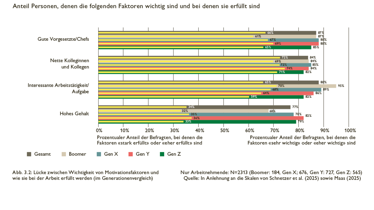 Bei den Rahmenbedingungen gibt es Aspekte, die demotivierend wirken. Bei den wichtigsten Motivationsfaktoren wird bei einem Teil der Gen Z die Erwartung nicht erfüllt. So bei Gehalt, Homeoffice und Arbeitszeiten. Das ist insofern bemerkenswert, weil gerade diese Motivatoren stark auf Identifikation und Commitment mit der Arbeit wirken.