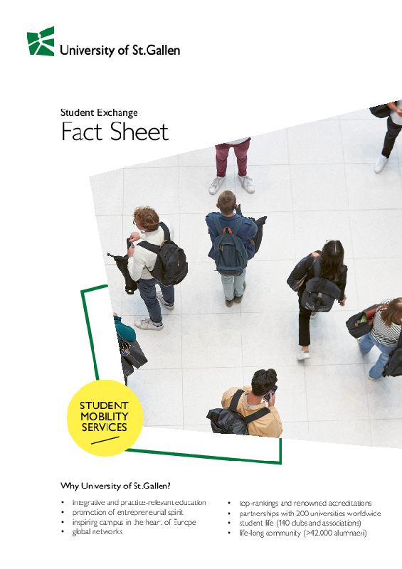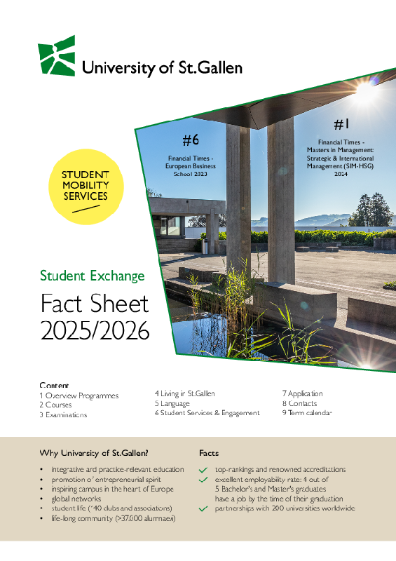 Bitte informieren Sie sich frühzeitig mit Hilfe des Kurswahl- und Prüfungsmerkblatt für Gaststudierende, um sich auf eine erfolgreiche Zeit in St.Gallen vorzubereiten. Detailliertere Informationen finden Sie hier: