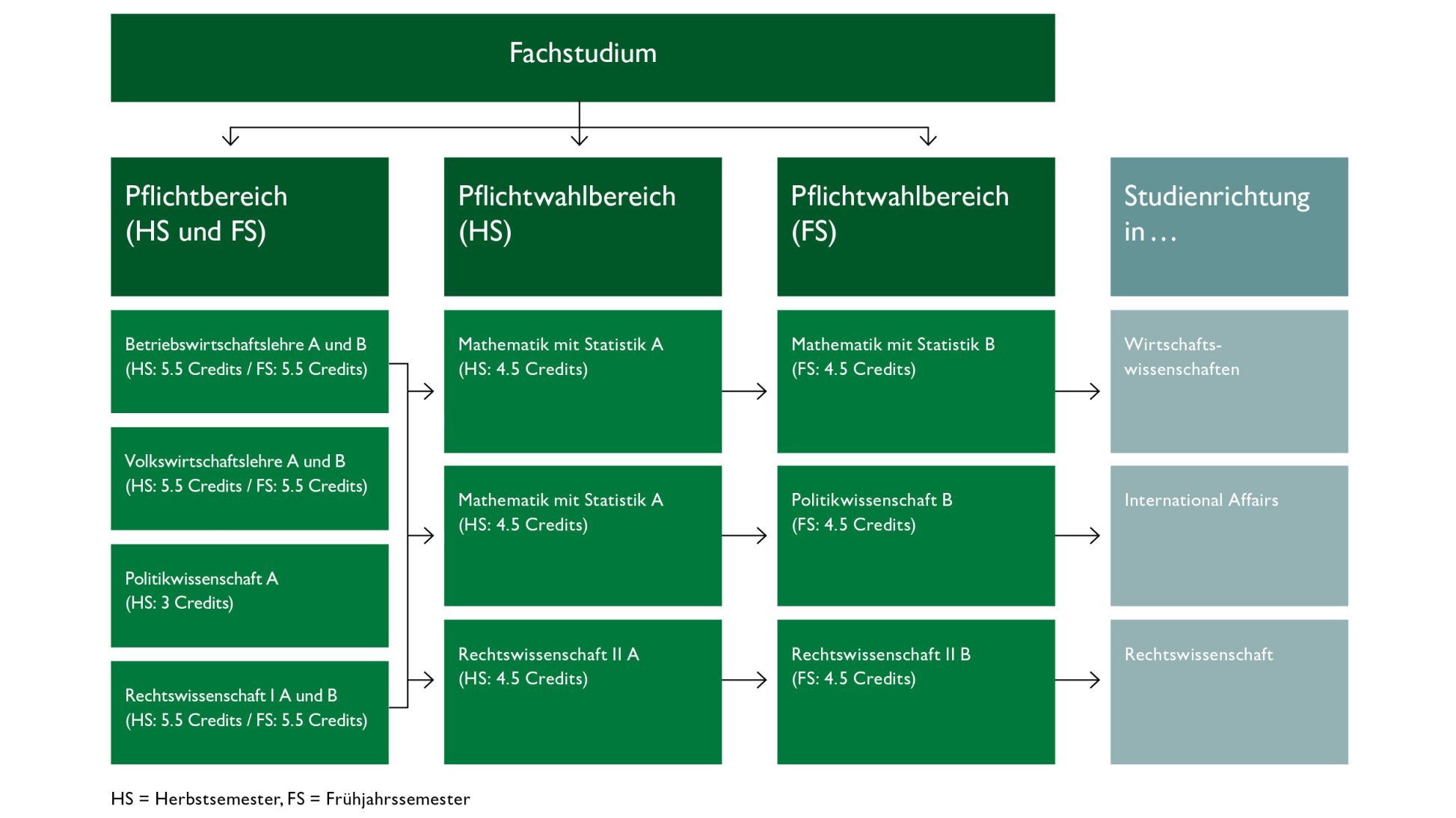 Das Fachstudium bildet den inhaltlichen Kern des Assessmentjahres. Alle Studierenden belegen die Pflichtfächer Betriebswirtschaftslehre (A und B), Volkswirtschaftslehre (A und B), Politikwissenschaft A und Rechtswissenschaft I (A und B). Ergänzend werden – je nach gewählter Richtung – die Pflichtwahlfächer Mathematik mit Statistik (A und B), Rechtswissenschaft II (A und B) oder Politikwissenschaft B belegt. Die Grafik zeigt, in welchem Semester welche Fächer als Pflicht- und Pflichtwahlfächer zu absolvieren sind.