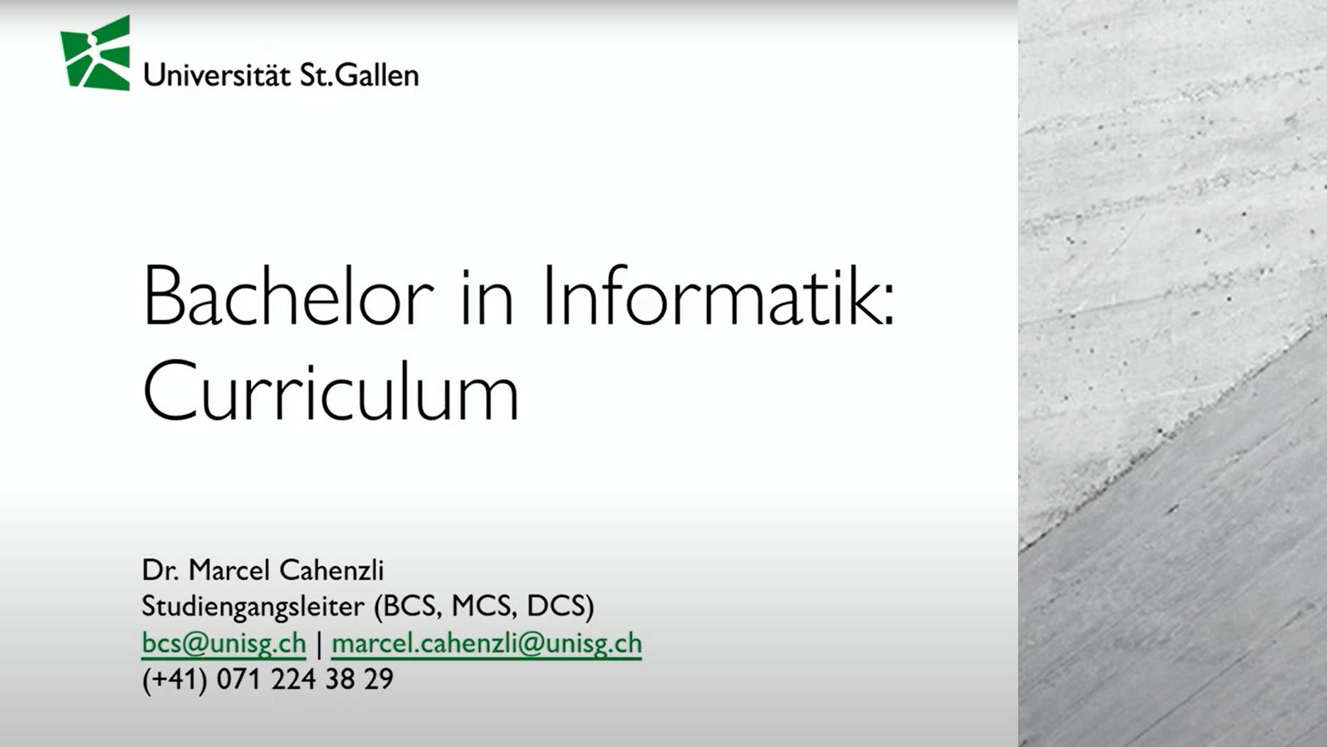 Die Illustration des Curriculums zeigt auf, wie sich der Lehrplan in Kurse aufteilt, welche technisch orientierte Kompetenzen aus dem Bereich Informatik (Grün), Wirtschaftskompetenzen (Weiss) und Reflexionskompetenzen (Beige) aufbauen. Damit handelt es sich beim Informatikstudium der Universität St.Gallen um eine Informatikausbildung, welche Anschluss zu Wirtschafts- und Gesellschaftsthemen, zur Start-up-Welt und zu interdisziplinären Kontexten schafft.