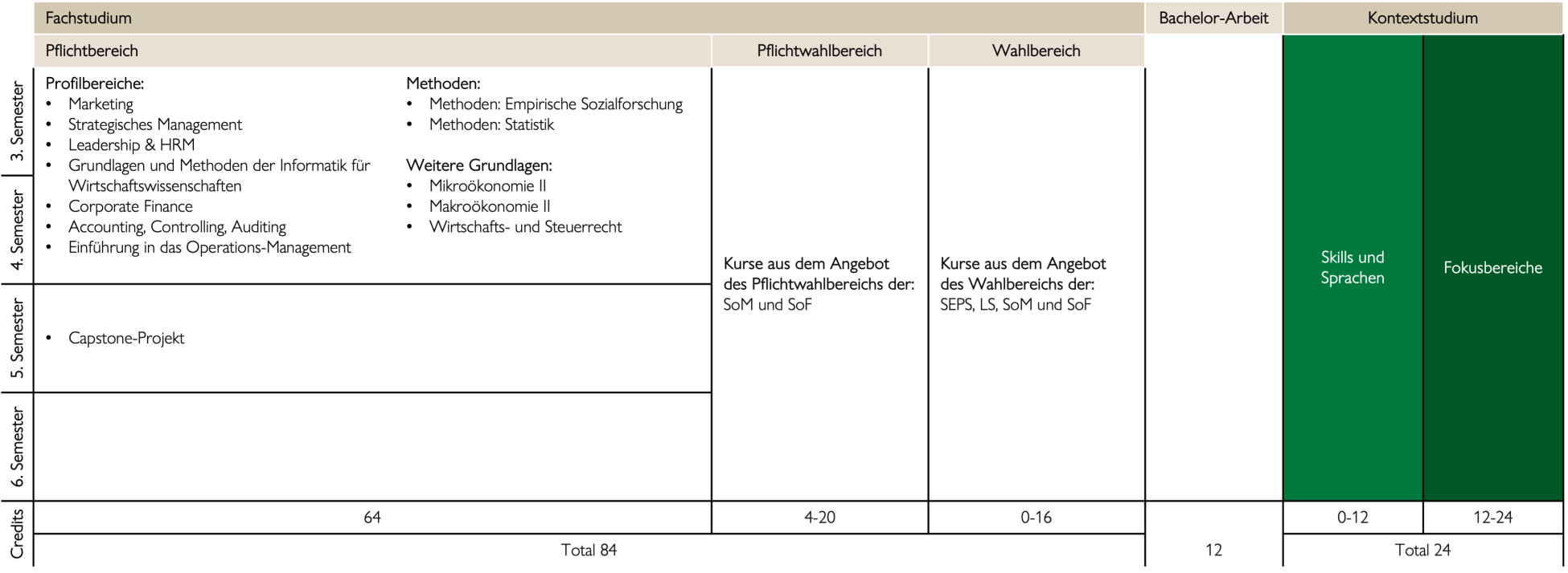 Das Curriculum unterscheidet zwischen Pflichtbereich, Pflichtwahl- und Wahlbereich sowie dem Kontextstudium. Abschlusselemente bilden das Capstone-Projekt und die Bachelor-Arbeit.