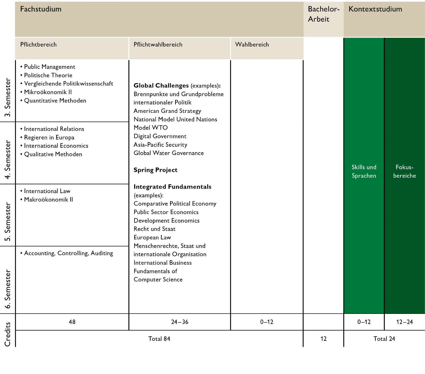Das Curriculum des Major International Affairs besteht aus drei Teilen: dem Fachstudium (84 ECTS-Credits, dem Kontextstudium (24 ECTS-Credits) und der Bachelor-Arbeit (12 ECTS-Credits). Während im Fachstudium die fachlichen Kompetenzen vermittelt werden, fokussiert das Kontextstudium den Ausbau der sozialen und kulturellen Kompetenzen.