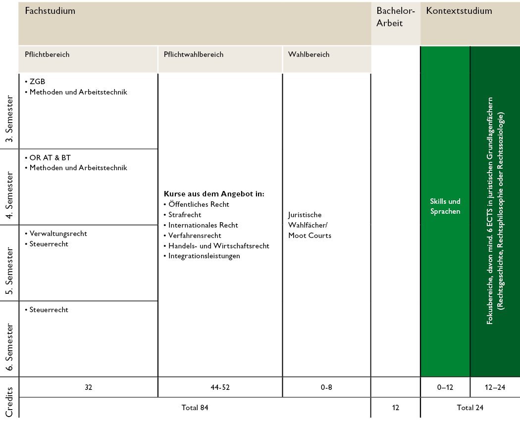 Die Bachelorausbildung setzt sich aus einem Fachstudium (96 ECTS) und einem Kontextstudium (24 ECTS) zusammen. Zusammen mit dem Assessmentjahr umfasst sie insgesamt 180 ECTS.