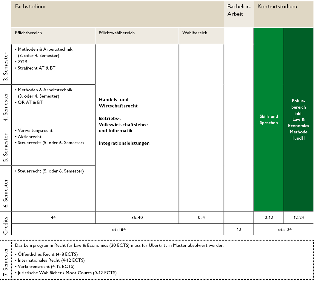 Die Pflichtfächer des BLE, die von allen Studierenden besucht werden, umfassen mit 44 ECTS das juristische Grundwissen auf den Gebieten des Privatrechts, des Strafrechts und des Öffentlichen Rechts. Im Pflichtwahlbereich wird eine Vertiefung im «Handels- und Wirtschaftsrecht» (4-8 ECTS) angeboten; zusätzlich ermöglichen die Gefässe «Betriebs-, Volkswirtschaftslehre und Informatik» (16-20 ECTS), «Integrationsleistungen» (16 ECTS) und «Wahlfach» (0-4 ECTS) eine individuelle Schwerpunktsetzung beim integrativen Teil der Law & Economics-Ausbildung.