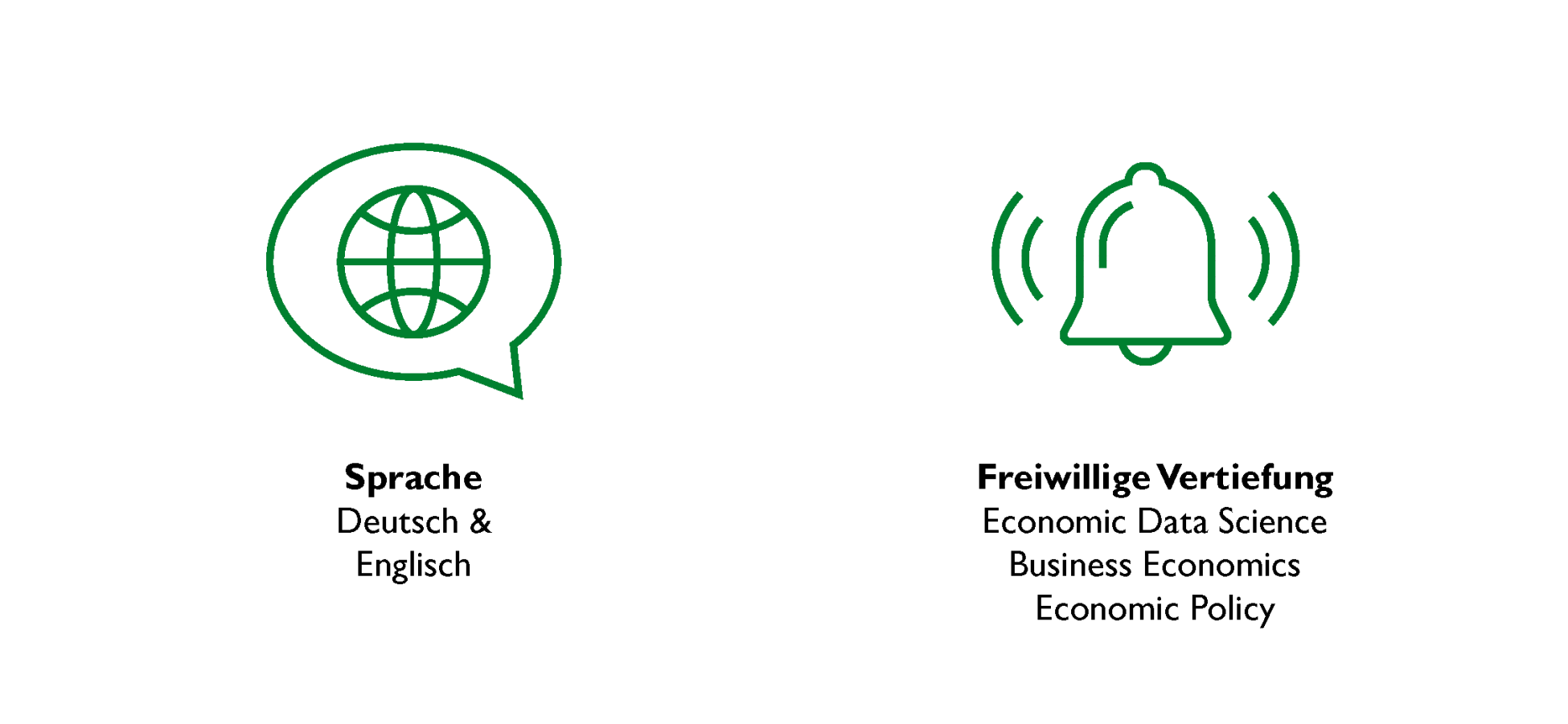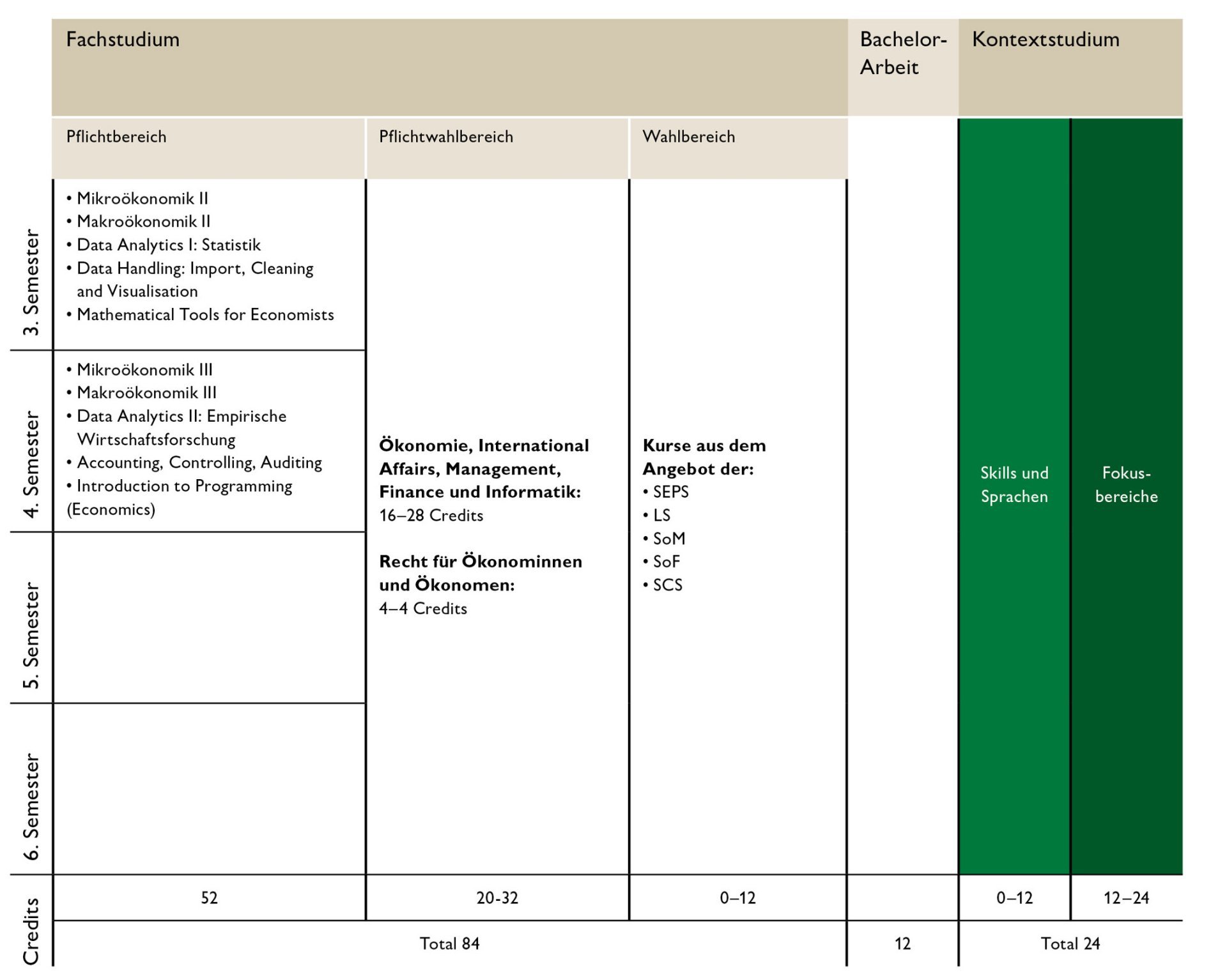 Ihr Fachstudium besteht aus dem Pflichtbereich, dem Pflichtwahlbereich und dem Wahlbereich, die wir im Folgenden gesondert vorstellen. Die Pflichtfächer geben Ihnen ein klares Profil. In zwei Semestern erhalten Sie eine fach- und themenbezogene Ausbildung in den Kerndiszipölinen der Volkswirtschaftslehre, Methodenkurse sowie betriebswirtschaftliche Grundkenntnisse im Umfang von insgesamt 52 ECTS-Credits. Dank der Konzentration auf das dritte und vierte Semester können Sie das fünfte und sechste Semester frei nach Ihren Vorstellungen gestalten und problemlos ein Austauschsemester absolvieren. Ergänzend dazu erarbeiten Sie sich wertvolle Insights zu den aktuellen wirtschaftlichen Themen und lernen den Umgang mit grossen Datenmengen.