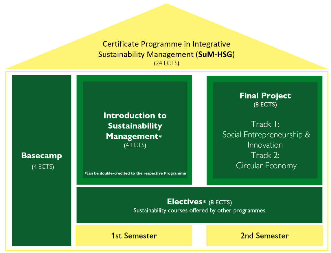 Für den Abschluss des Lehrprogramms Integrative Sustainability Management (SuM-HSG) müssen Sie insgesamt Studienleistungen im Umfang von 24 ECTS Punkten ablegen.