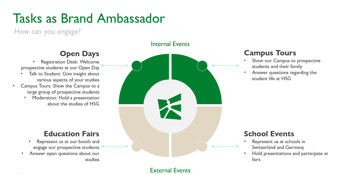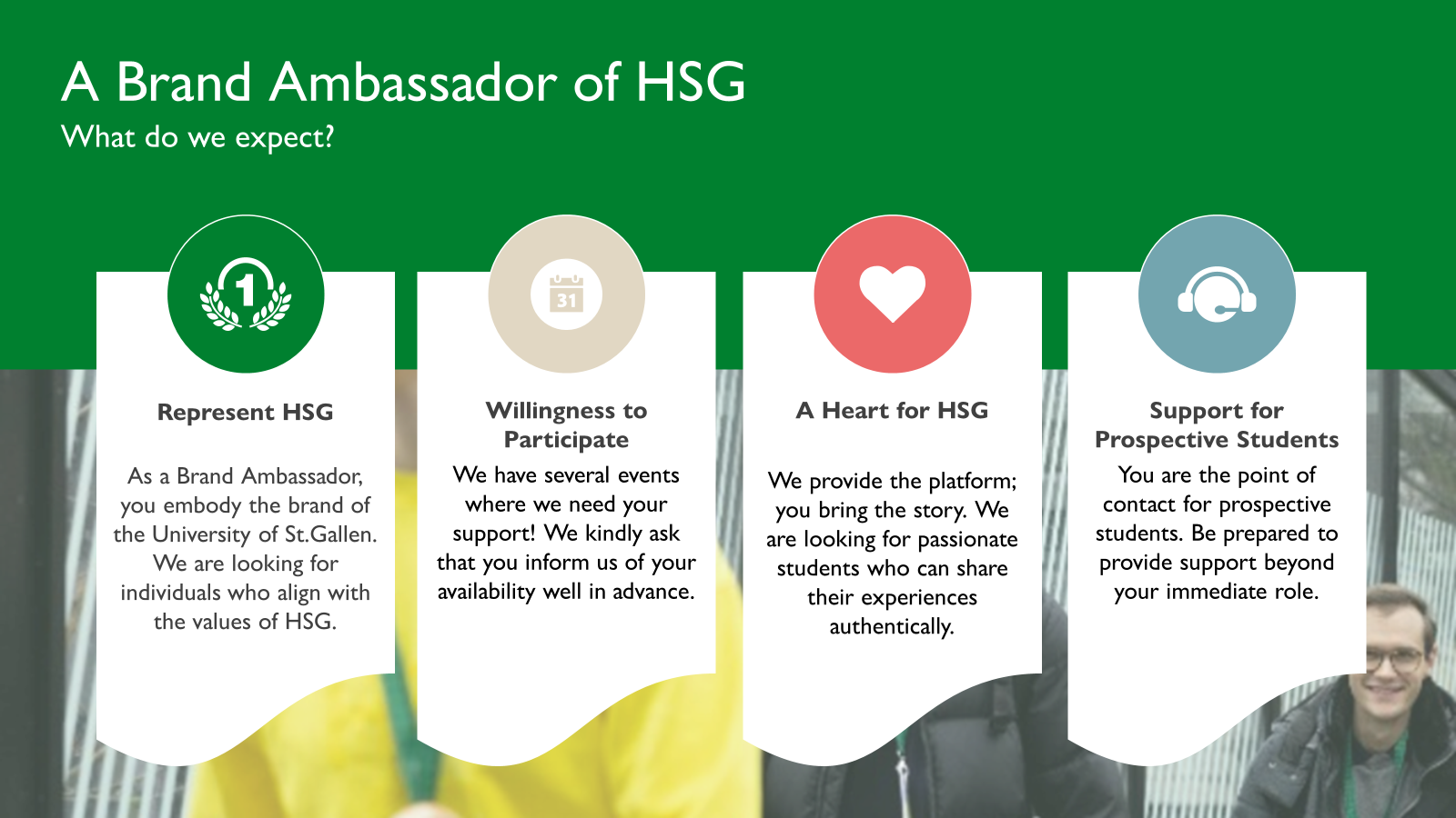 We are seeking motivated and communicative students who are passionate about embodying and sharing our values and vision – whether at events or through direct interactions with prospective students. Help us to shape the next generation of HSG students!