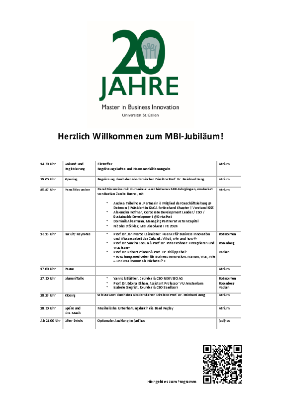 Der Master in Business Innovation (MBI) feiert in diesem Jahr sein 20-jähriges Jubiläum – ein Meilenstein, den wir gebührend feiern möchten. Wir freuen uns sehr darauf, am Freitag, 4. Oktober 2024 auf zwei Jahrzehnte zurückzublicken und gemeinsam auf die Zukunft anzustossen.
