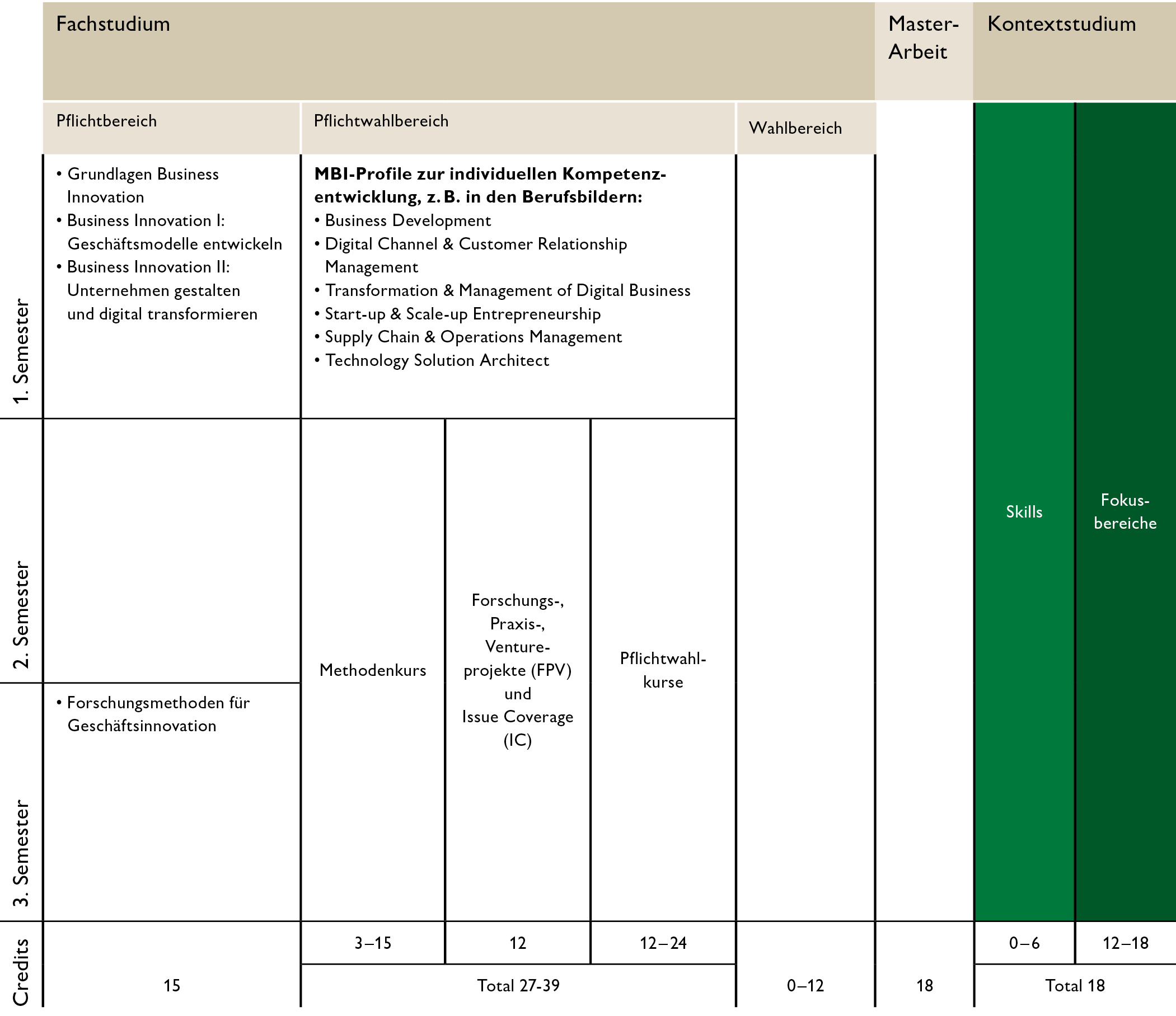 Ein 15 Credits starker Pflichtbereich vermittelt Ihnen die Grundlagen in Business Innovation, im Pflichtwahlbereich konzentrieren sich die Kernkompetenzen zu sechs MBI-Profilen.