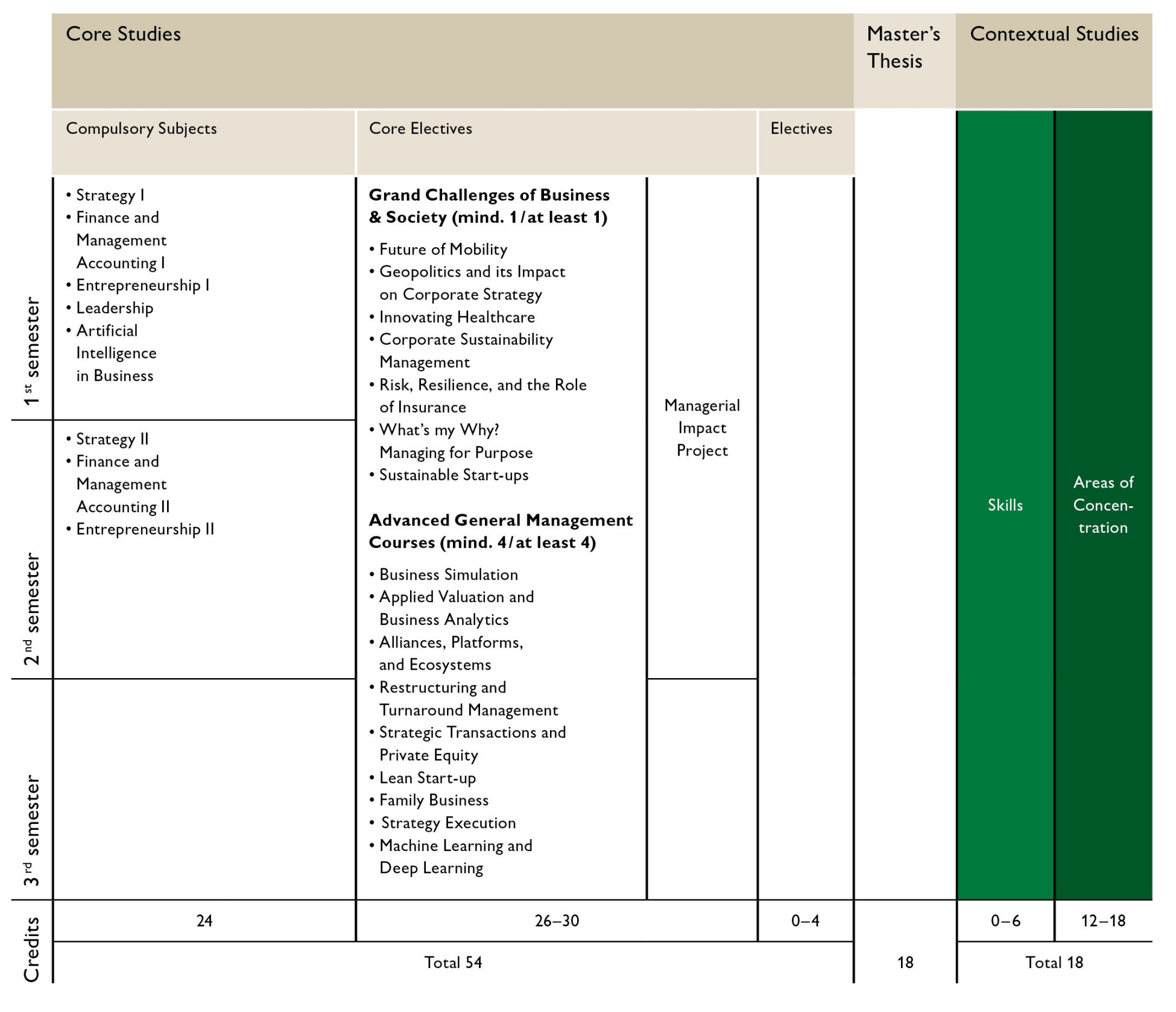 Ihr Fachstudium besteht aus einem Pflichtbereich und einem Pflichtwahlbereich (Advanced General Management Courses, Managerial Impact Project, Grand Challenges of Business and Society), die wir im Folgenden gesondert vorstellen. Die Pflichtfächer geben Ihnen ein klares Profil, das für rekrutierende Unternehmen, aber auch für die Unternehmensnachfolge oder die Gründung eines eigenen Unternehmens wie geschaffen ist. In zwei Semestern erhalten Sie eine einzigartige akademische Ausbildung in unseren drei Kerndisziplinen Entrepreneurship, Strategy sowie Finance & Management Accounting.