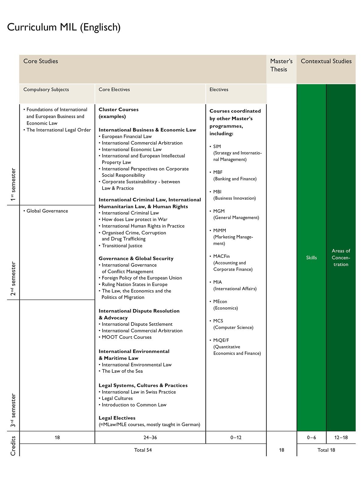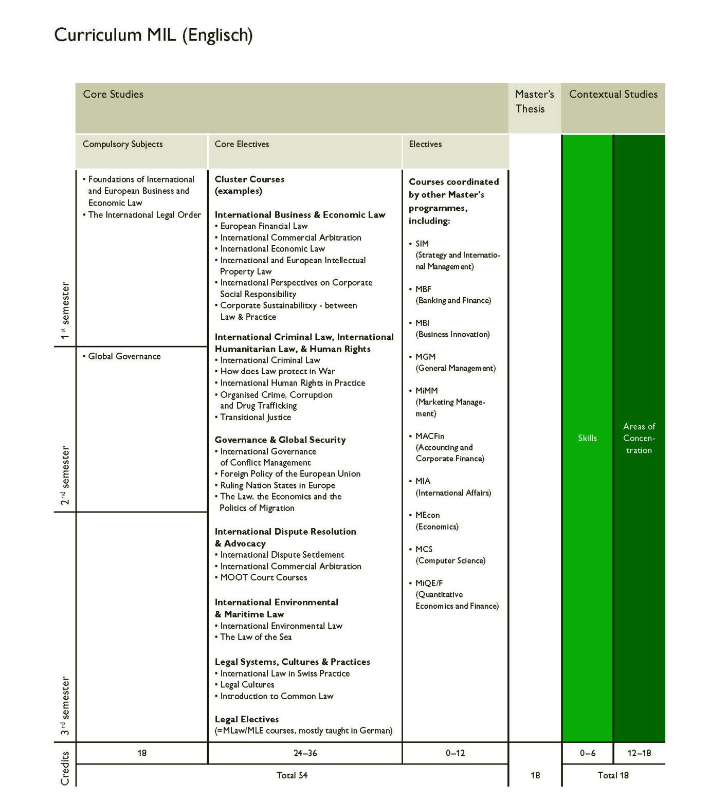 Der MIL bietet eine sorgfältig zusammengestellte Auswahl an Pflichtwahlfächern. Diese Kurse sind darauf ausgelegt, das Verständnis der Studierenden für das Recht, einschliesslich hochspezifischer internationaler Rechtsregime, zu vertiefen. Da die meisten Studierenden mindestens drei Semester benötigen, um den MIL abzuschliessen, werden die meisten Kurse nur alle zwei Jahre angeboten. Dieser zweijährige Zyklus ist einer der Gründe für die grosse Vielfalt im MIL-Curriculum. Ebenso ermöglicht dies, die besten internationalen Lehrkräfte an Bord zu haben. Obwohl Änderungen vorbehalten sind, werden die Pflichtwahlfächer in der Regel wie folgt angeboten: