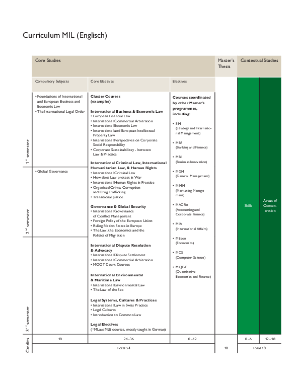 Ein besonderes Merkmal des MIL-Curriculums ist die sorgfältig abgestimmte Kombination aus Pflichtkursen und Pflichtwahlfächern. Drei Kurse sind für die Studierenden verpflichtend: „Die internationale Rechtsordnung“ und „Grundlagen des internationalen und europäischen Wirtschaftsrechts“ im Herbstsemester sowie „Global Governance“ im Frühjahrssemester. Diese drei Kurse ermöglichen es den Studierenden, ein fundiertes Verständnis des normativen und analytischen Rahmens von Recht und Governance zu erlangen. Jeder dieser Kurse wird von einem angesehenen Dozenten der St. Galler Fakultät unterrichtet, nämlich L. Grover, T. Burri und C. Frei.