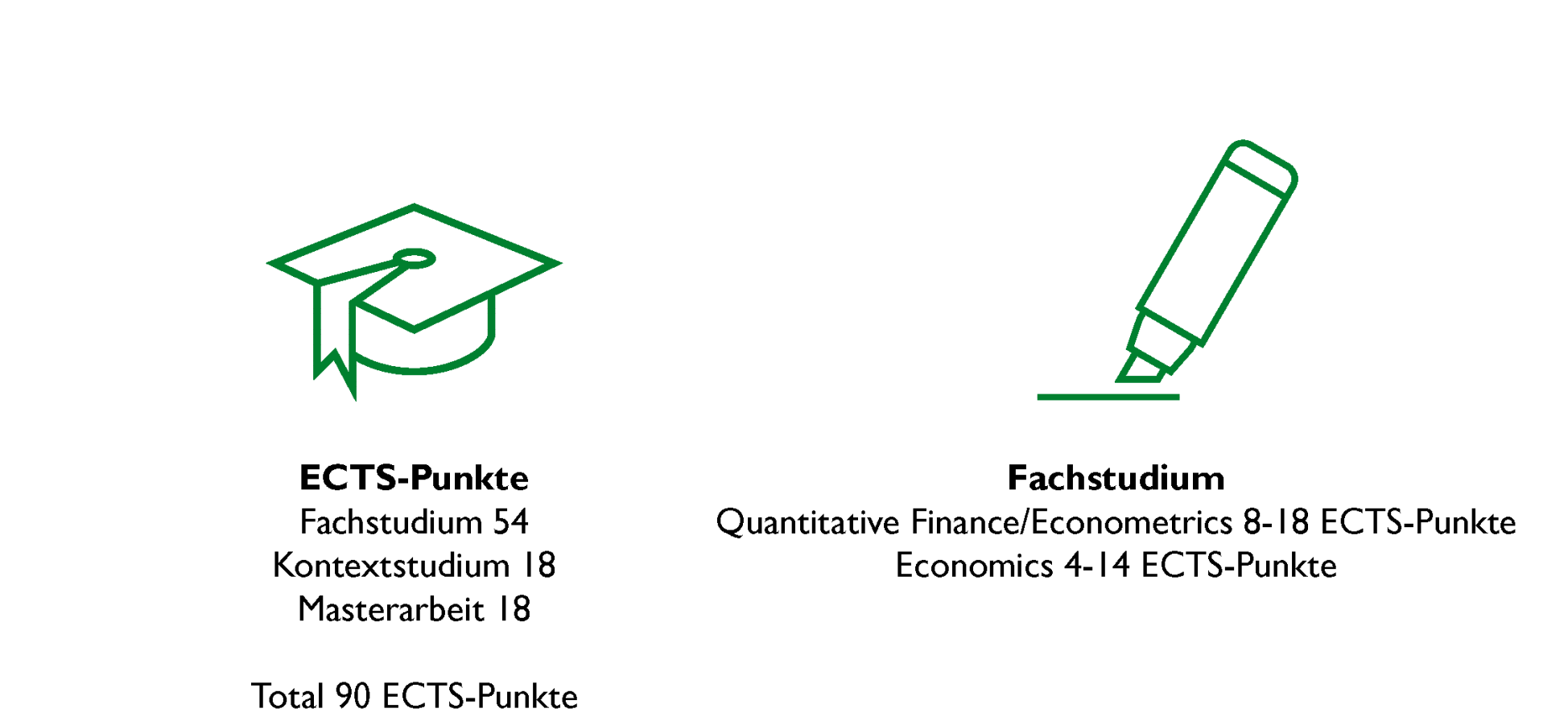 Das Fachstudium deckt durch die Wahl von Schwerpunktkursen in Quantitative Finance/Econometrics mit mindestens zwei Veranstaltungen (8-18 ECTS) sowie der Schwerpunktbereich Economics mit mindestens einer Veranstaltung (4-14 ECTS), den Kontext der volks- und finanzwirtschaftlichen Herausforderungen ab. Der übrige Pflichtwahlbereich komplementiert das Angebot. Während im Fachstudium die fachlichen Kompetenzen im Bereich Finanzen, Ökonometrie, Quantitativer Methoden und Volkswirtschaftslehre geschult werden, fokussiert sich das Kontextstudium den Ausbau auf die Entwicklung sozialer und kultureller Kompetenzen.