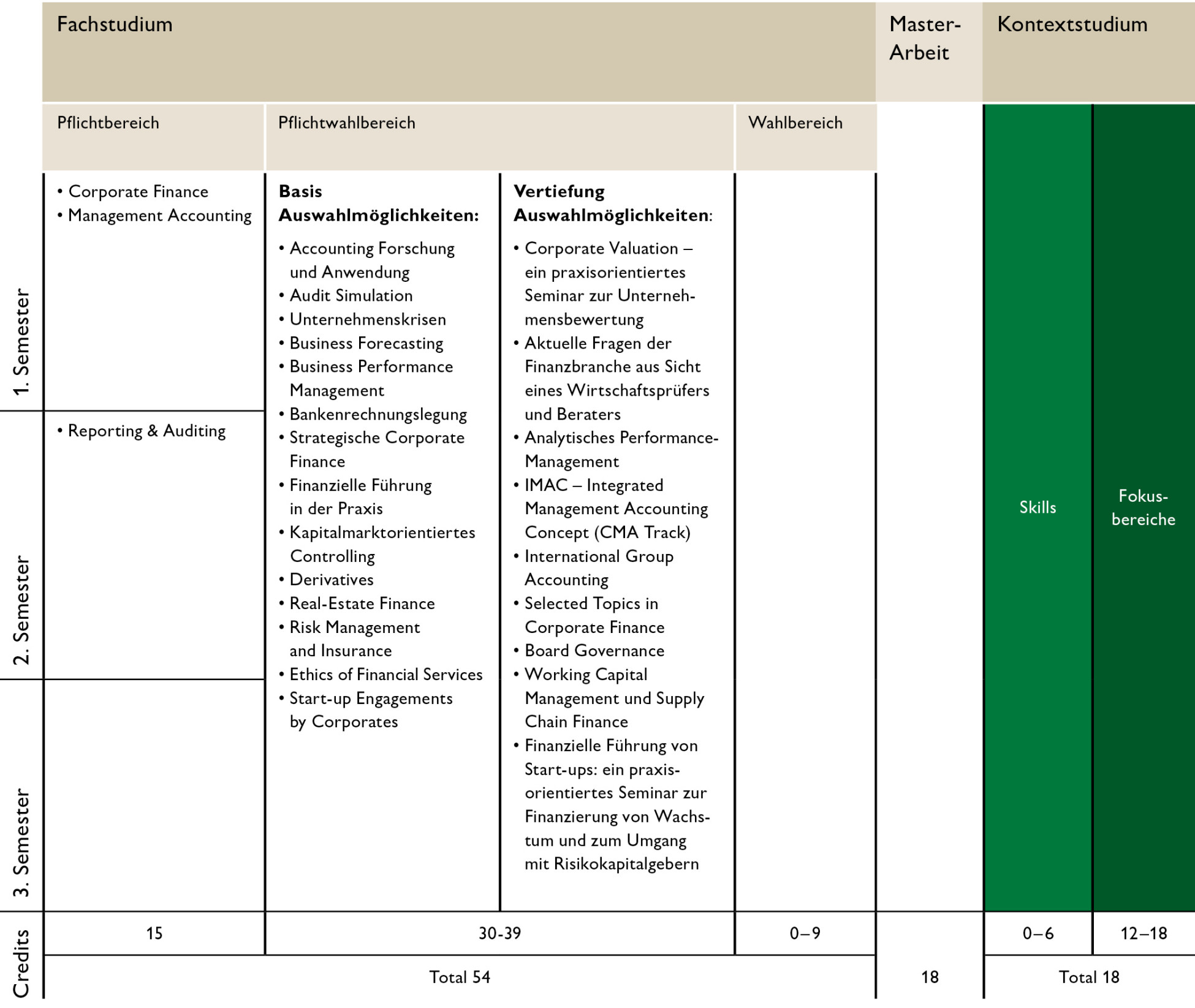 Der Basis-Pflichtwahlbereich deckt die Breite der finanziellen Führung durch die Wahl von mindestens vier Veranstaltungen (12 – 27 ECTS) ab, während der Vertiefungs-Pflichtwahlbereich mindestens zwei umfangreiche Kurse (12 – 24 ECTS) zur Spezialisierung und Vorbereitung auf den Berufseinstieg umfasst.