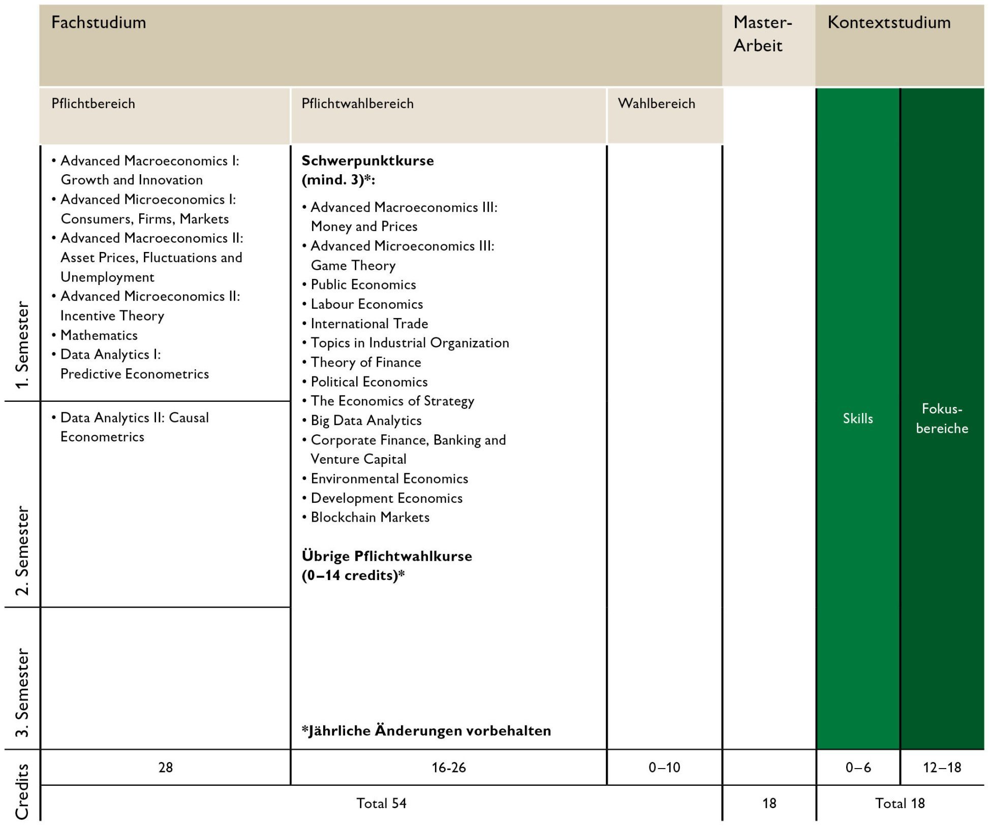 Der Schwerpunktbereich deckt die Breite der Volkswirtschaftslehre durch die Wahl von mindestens drei Veranstaltungen (12 – 26 ECTS) ab, während der übrige Pflichtwahlbereich das Angebot komplettiert. Während im Fachstudium die fachlichen Kompetenzen der Studierenden im Bereich der Volkswirtschaftslehre geschult werden, fokussiert sich das Kontextstudium den Ausbau auf die Entwicklung sozialer und kulturelle Kompetenzen.
