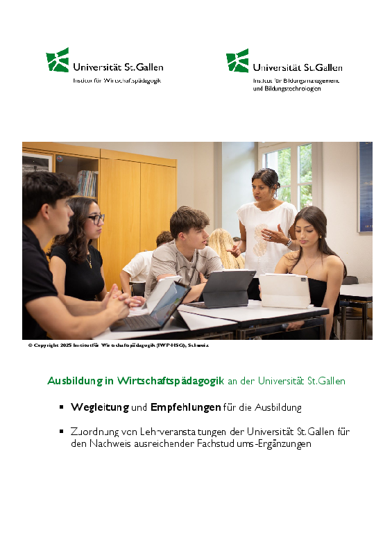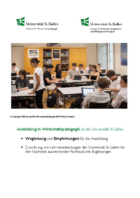 Es handelt sich um eine zusätzliche Ausbildung, welche nur in Verbindung mit einem universitären Master-Abschluss erworben werden kann. Das Studium in Wirtschaftspädagogik kann während der Bachelor-Ausbildung, bei Eintritt in die Master-Stufe oder als zusätzliche Ausbildung im Anschluss an das Master-Studium begonnen werden.