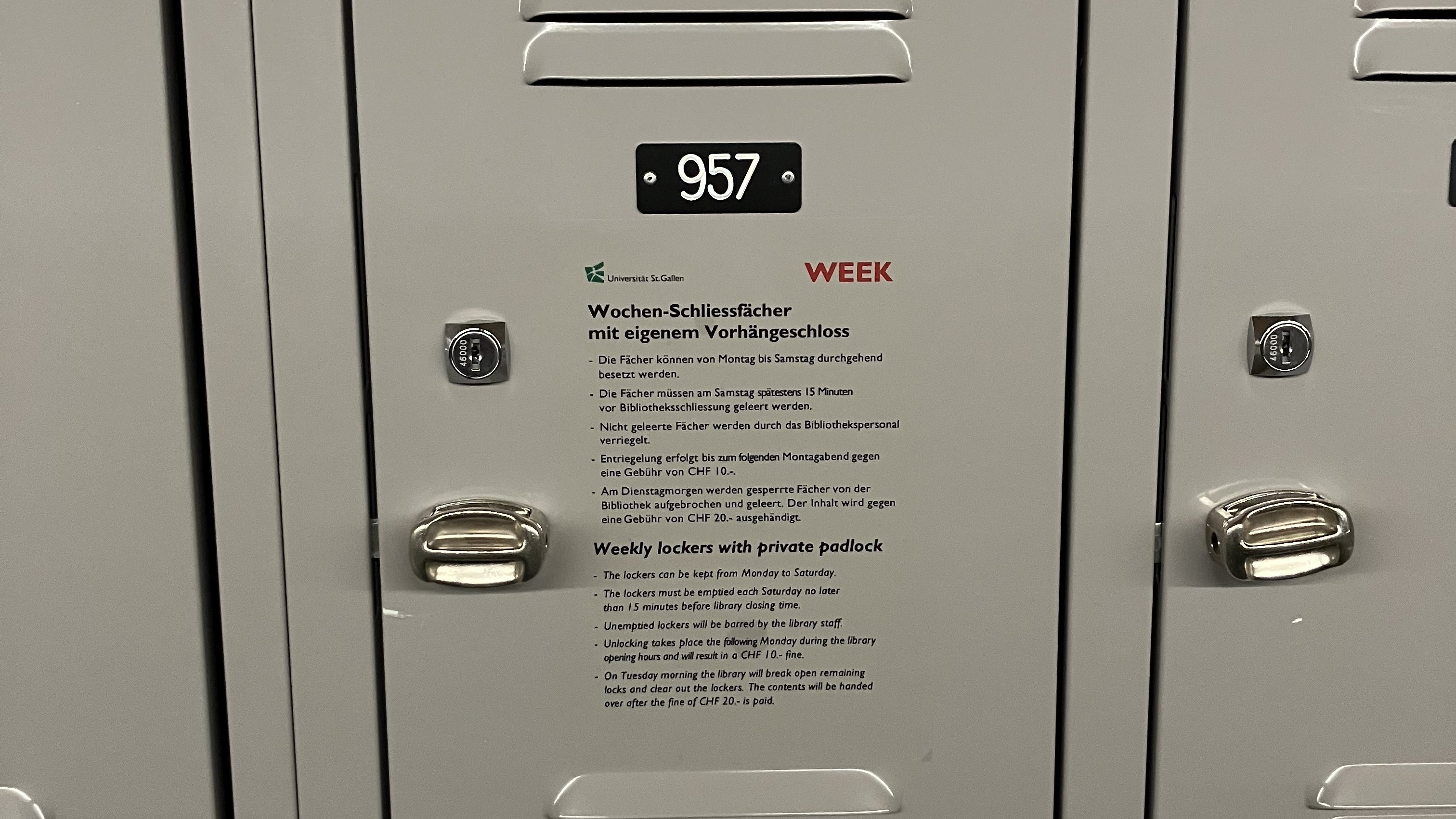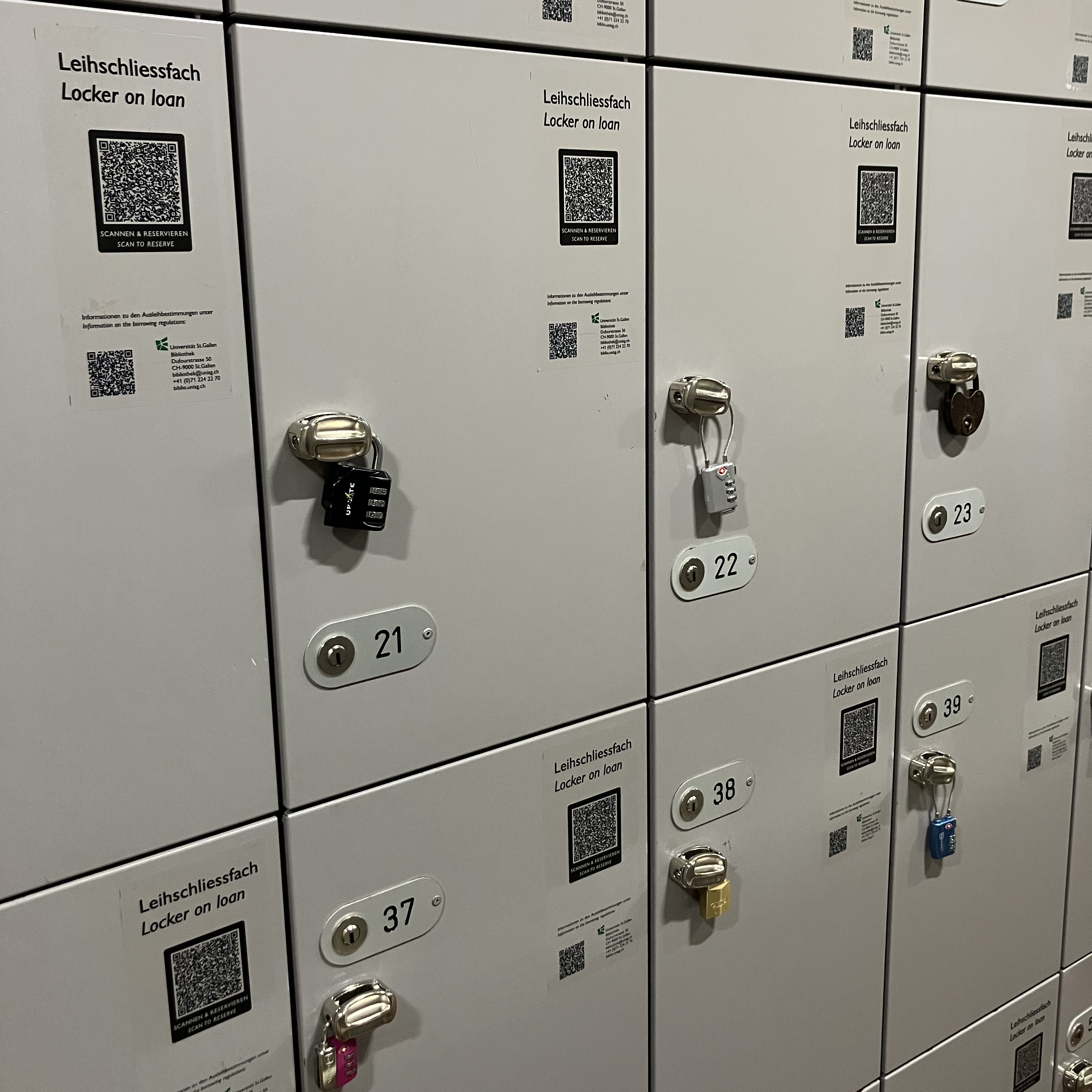 Für eingeschlossene Gegenstände, Beschädigung oder mutwilliges Aufbrechen der Vorhängeschlösser lehnt die Bibliothek der Universität St. Gallen jegliche Haftung ab.