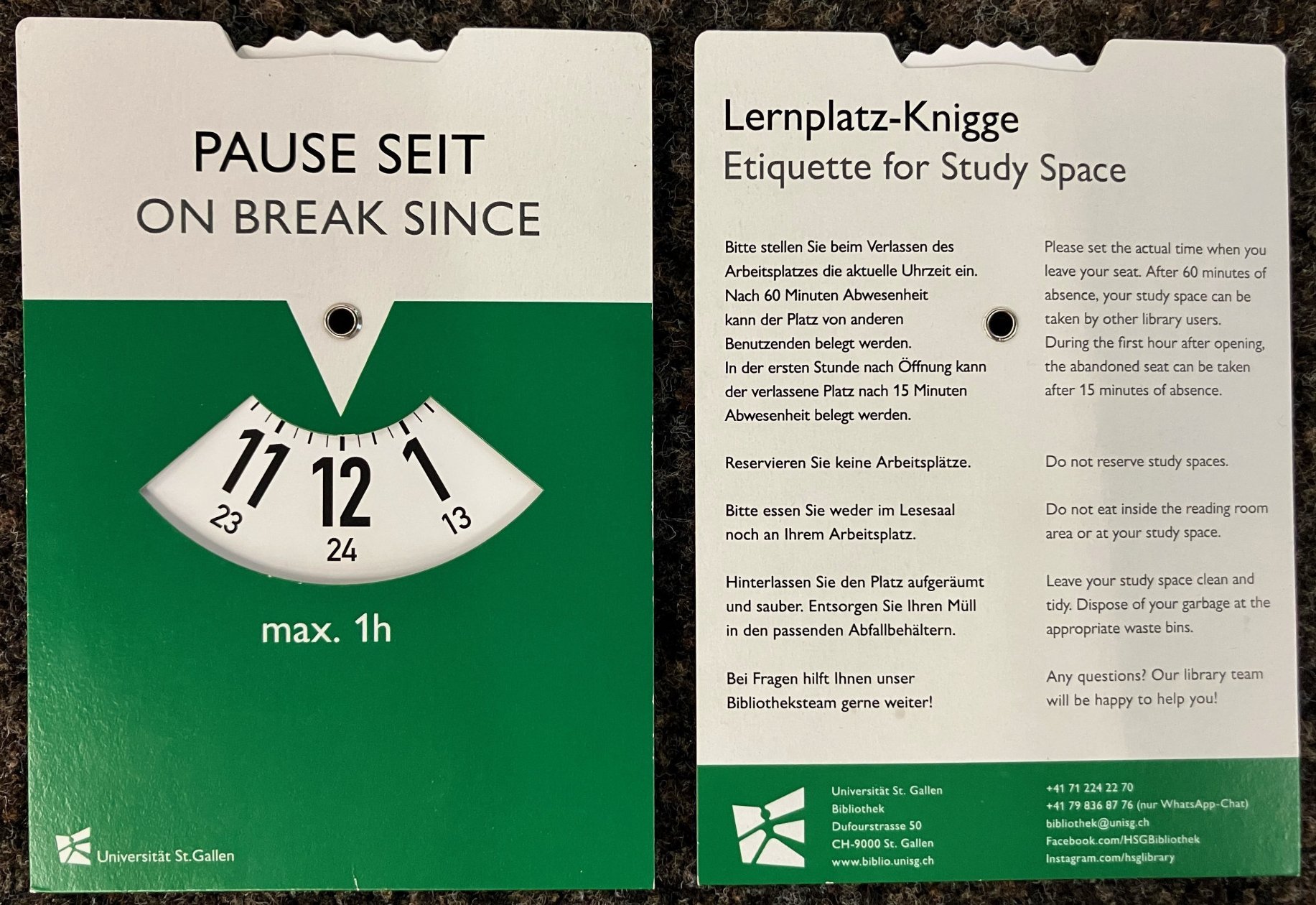 Lernplätze sind ein rares Gut – speziell zu Zeiten der Lernphase. Damit diese auch effizient genutzt werden können und nicht durch lange Abwesenheiten besetzt sind, wird in der HSG-Bibliothek die Pausenscheibe genutzt. Helfen Sie mit, langen Platzreservationen und unnötigen Engpässen in der Platzverfügbarkeit Abhilfe zu schaffen!
