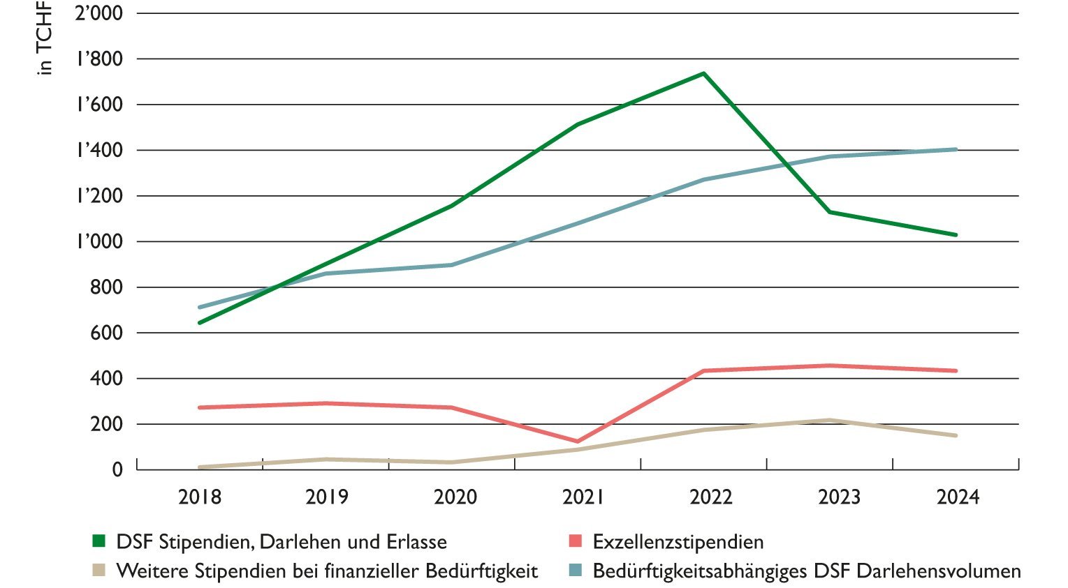 In 2024 haben 106 Studierende eine Unterstützung durch den HSG Darlehens- und Stipendienfonds im Gesamtumfang von ca. CHF 1'000'000 erhalten. Zusätzlich wurden ca. CHF 150'000 an weiteren bedürftigkeitsabhängigen Stipendien an insgesamt 32 Studierende gewährt, und 41 Exzellenzstipendien im Gesamtumfang von ca. CHF 450'000 gesprochen.