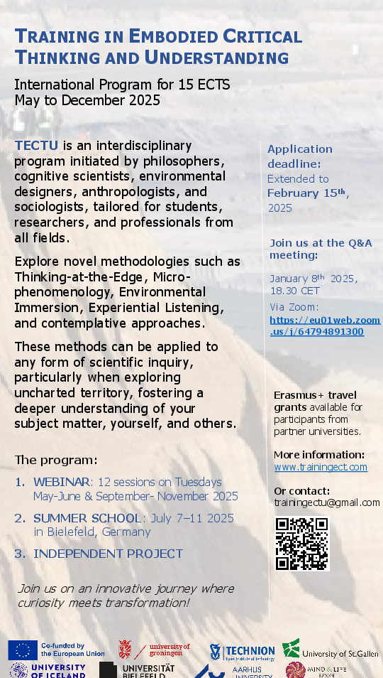 Christine Abbt ist ab 2025 Kooperationspartnerin im Erasmus+ Programm "Training Embodied Critical Thinking (TECTU)". Damian Nussbaumer wirkt in der Lehre und Organisation mit. TECTU ist ein interdisziplinäres Ausbildungsprogramm, das von Philosoph:innen, Informatiker:innen, Kognitionswissenschaftler:innen und Umweltdesigner:innen initiiert wurde. TECTU bietet neue Ansätze und Methoden für Studierende und Forschende, um kritisch und kreativ zu denken, und trägt so zur Veränderung und Bereicherung der Fähigkeit des kritischen Denkens im 21. Jahrhundert bei.