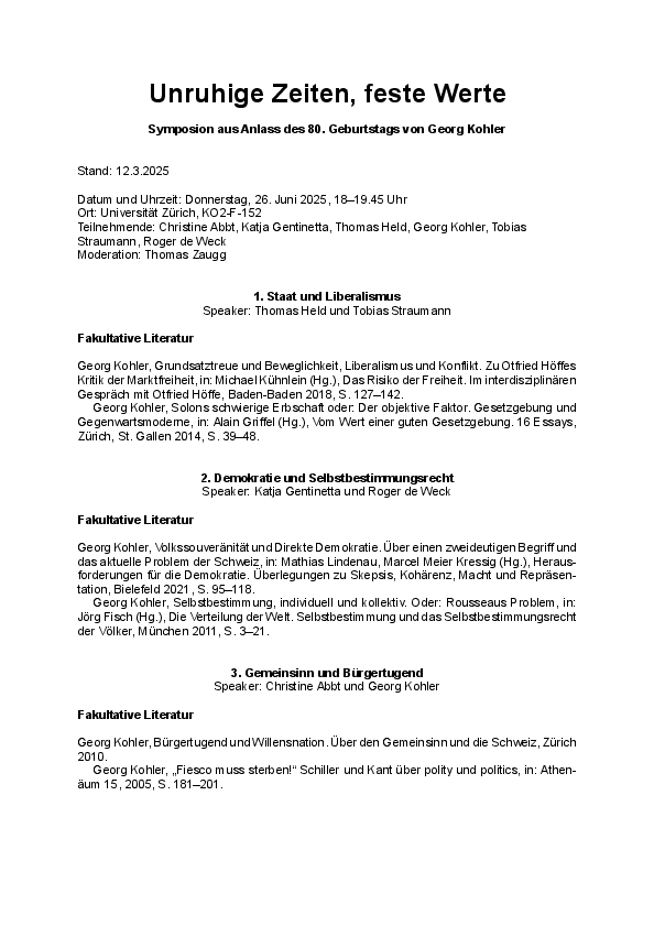 Teilnehmende: Christine Abbt, Katja Gentinetta, Thomas Held, Georg Kohler, Tobias Straumann, Roger de Weck