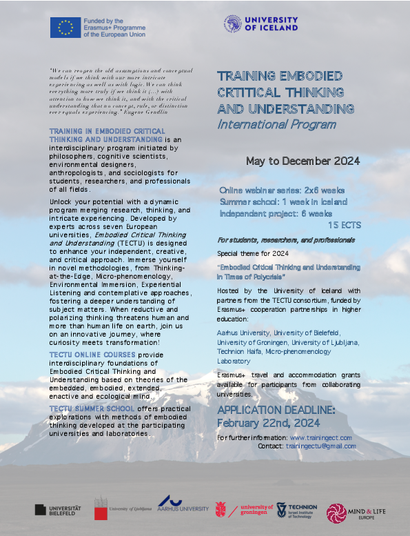 Christine Abbt ist ab 2025 Kooperationspartnerin im Erasmus+ Programm "Training Embodied Critical Thinking (TECTU)". TECTU ist ein interdisziplinäres Ausbildungsprogramm, das von Philosoph:innen, Informatiker:innen, Kognitionswissenschaftler:innen und Umweltdesigner:innen initiiert wurde. TECTU bietet neue Ansätze und Methoden für Studierende und Forschende, um kritisch und kreativ zu denken, und trägt so zur Veränderung und Bereicherung der Fähigkeit des kritischen Denkens im 21. Jahrhundert bei.