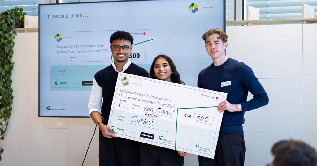 Die Entscheidung über die Vergabe des «SHSG Next Gen Impact Innovation Award» fiel anschliessend in einem kombinierten Voting von Jury und Publikum. Der erste Platz ist mit 2000 Franken dotiert, der zweite mit 500 Franken; beide Preise werden von der Studentenschaft der Universität St. Gallen (SHSG) gestiftet.