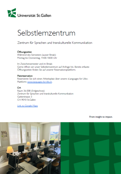 | Während des Semesters (ausser Break): Montag - Donnerstag, 14 - 18 Uhr Im Zwischensemester und im Break: Gerne öffnen wir unser Selbstlernzentrum auf Anfrage hin. Bereits erfasste Öffnungszeiten finden Sie auf unserer Reservationsplattform. | Reservieren Sie sich einen Arbeitsplatz über unsere «Languages for Life»-Plattform: www.languages-for-life.ch | Zentrum für Sprachen und transkulturelle Kommunikation Gatterstrasse 3 CH-9010 St.Gallen Link zu Google Maps |