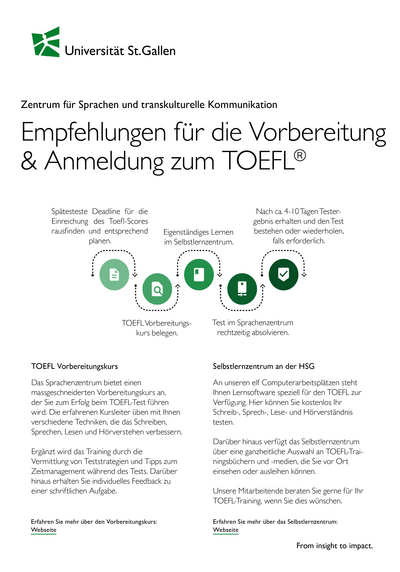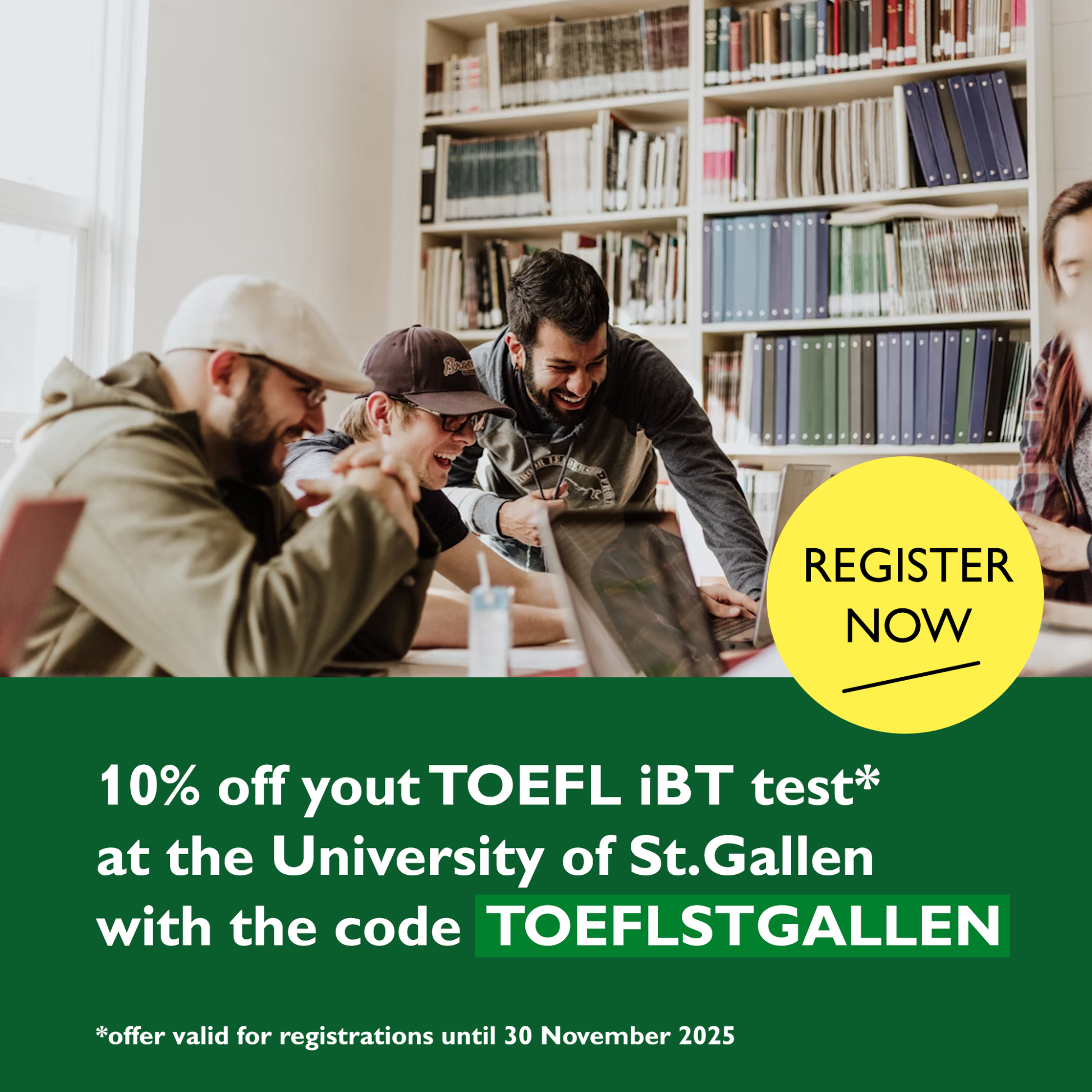 Sie können Ihren TOEFL in unserem Test Centre auf dem Campus der Universität St.Gallen ablegen.