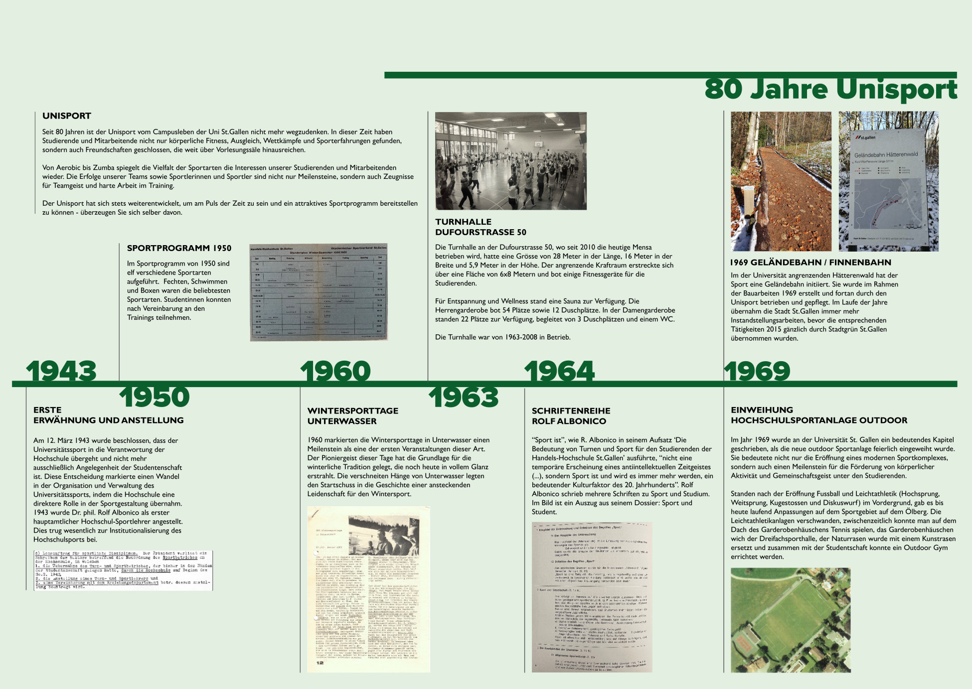 Der Unisport St.Gallen leistet einen massgebenden Beitrag zu den gesellschaftlich relevanten Themen Sport, Bewegung, Gesundheit, Leistung, Persönlichkeitsentwicklung und Inklusion sowie regionalen und internationalen Vernetzung. Damit fördert der Unisport St.Gallen integrativ denkende und handelnde Persönlichkeiten und verantwortungsvolles Handeln und eine integrative Wissensversorgung in den Themenbereichen Sport, Gesundheit und Persönlichkeit.