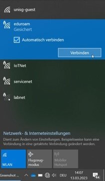 Klicken Sie nun auf "Eduroam" und anschliessend auf "Verbinden"