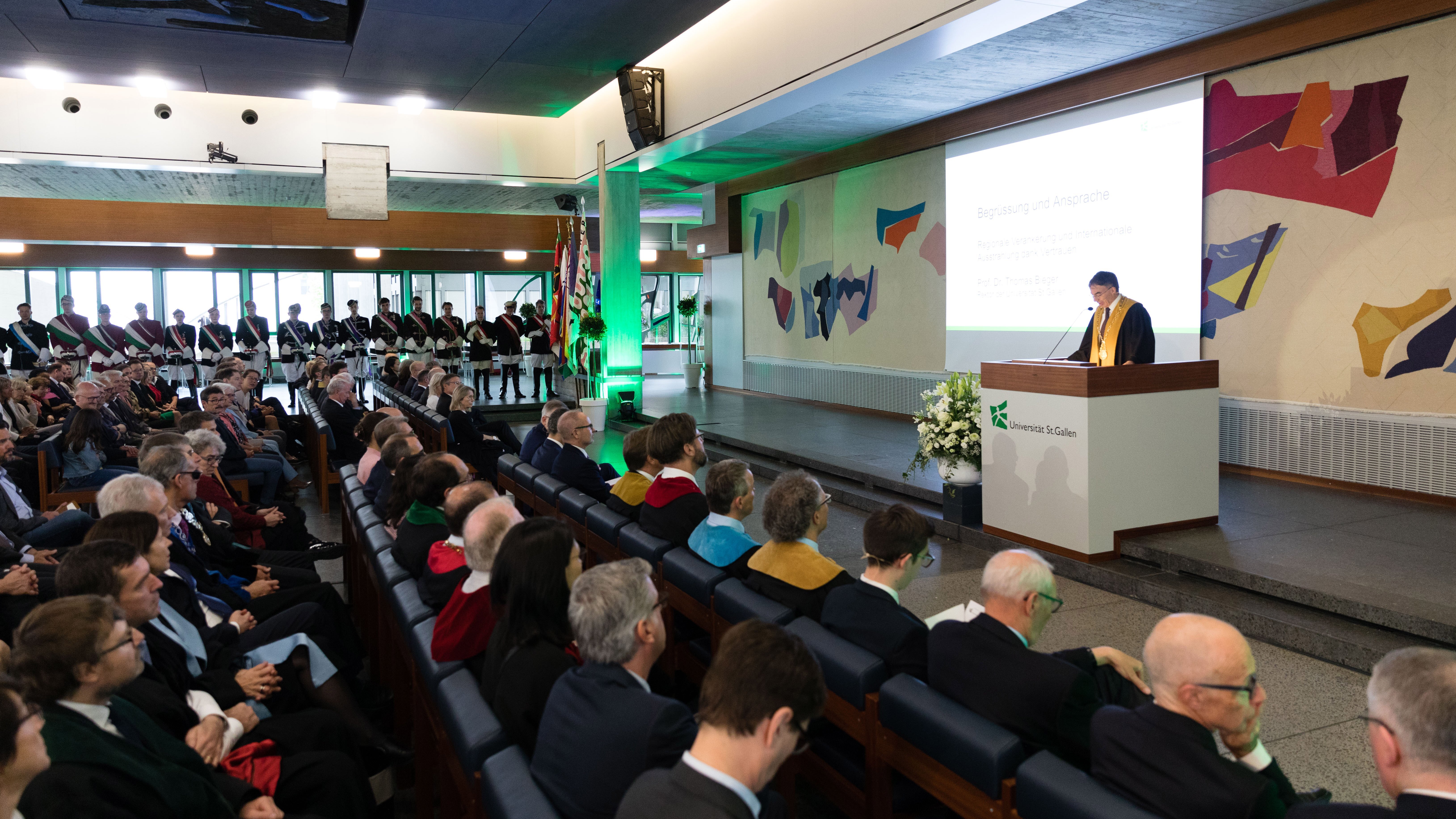 «Dringendes Postulat ist die baldige Einführung eines Dies academicus mit offiziellem wissenschaftlichen Festakt in der Aula und anschliessendem gemeinsamen Bankett oder Kommers. Bisher kommen Schulrat, Dozentenkollegium und Studierende nie zusammen, so dass man sich gegenseitig ja kaum kennt. Die Feier würde sich allmählich in St.Gallen einleben; sie wäre dazu angetan, die Bedeutung der Hochschule alljährlich einmal weiten Kreisen in Erinnerung zu rufen».