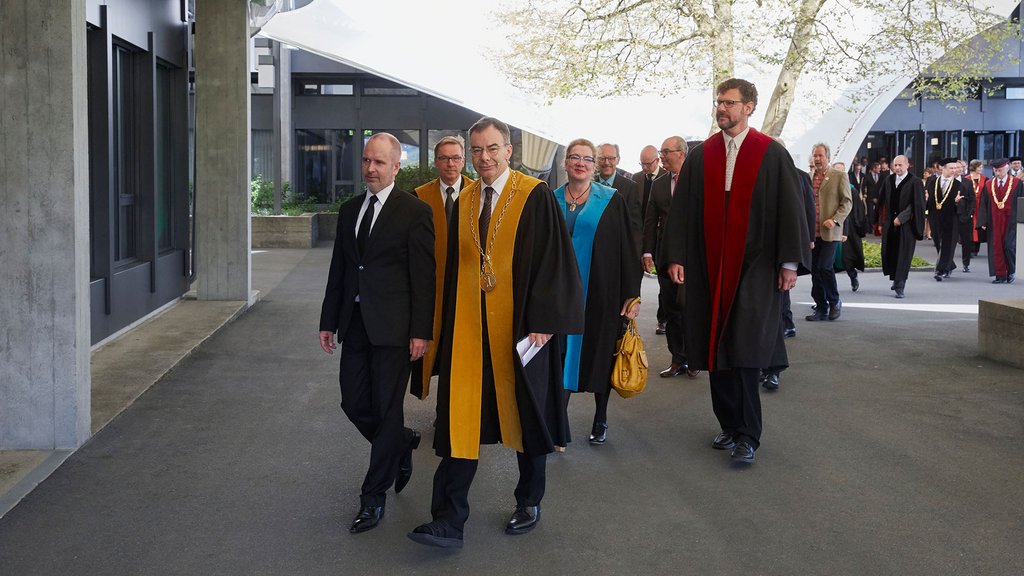 21 May 2017. Numerous guests from academia, business and politics – among them the Chairman of the University's Board of Governors, Education Minister Stefan Kölliker, National Councillor Walter Müller, Councillor of State Paul Rechsteiner, Minister of Economic Affairs Bruno Damann (Canton of St.Gallen) and Education Minister Roland Inauen (Canton of Appenzell Innerrhoden), as well as representatives of 13 universities from home and abroad – together celebrated the University of St.Gallen’s greatest day of the year, the dies academicus.