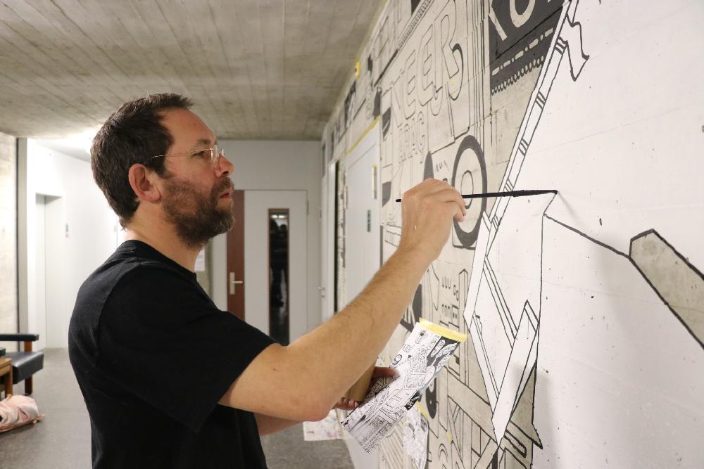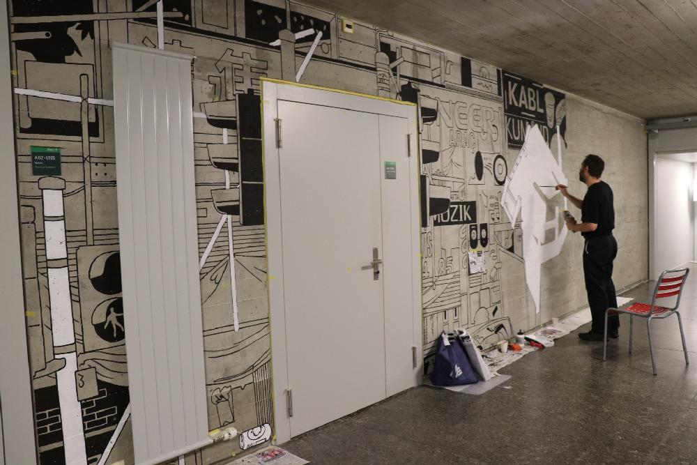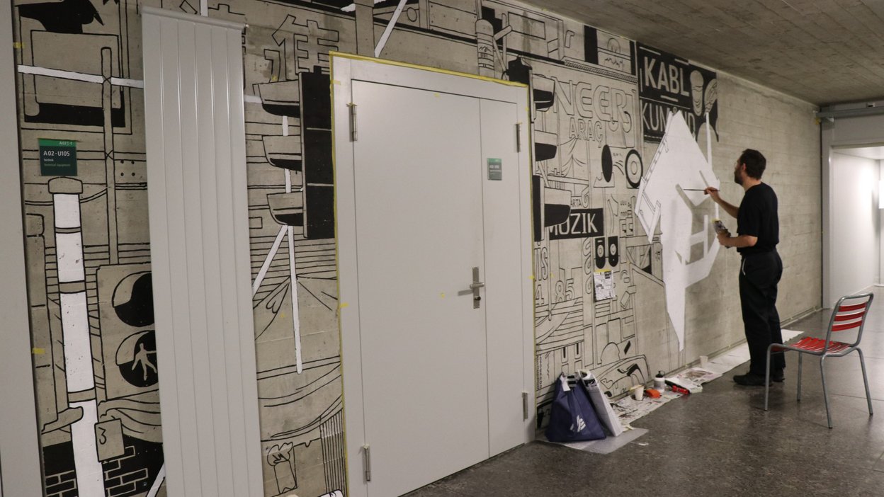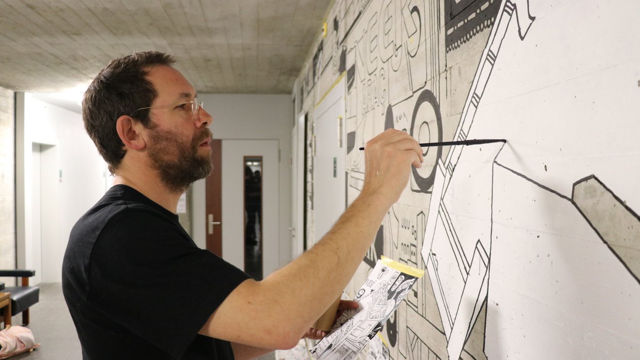 Giezendanner transfers sketches that he made during trips to Tokyo, Istanbul, Milan, Hong Kong and Karachi, enlarged on the concrete wall. ‘I wander through cities with my sketchbook and sometimes spend hours on a street corner for my drawings,’ says Giezendanner. The sketches show details of dense urban life such as traffic lights, shop windows, advertising and technical installations. His picture at the HSG is created entirely by hand in acrylic paints. His style, says Giezendanner, was inspired by comics and street art, among other things. He has already painted several large-format murals in public spaces. For example, in 2024 he painted a 10 x 13-metre mural on the firewall of a private building in Zurich-Enge, and in 2015 he created a hidden object scene entitled ‘The World. Here with you.’ at the Triemli City Hospital in Zurich.