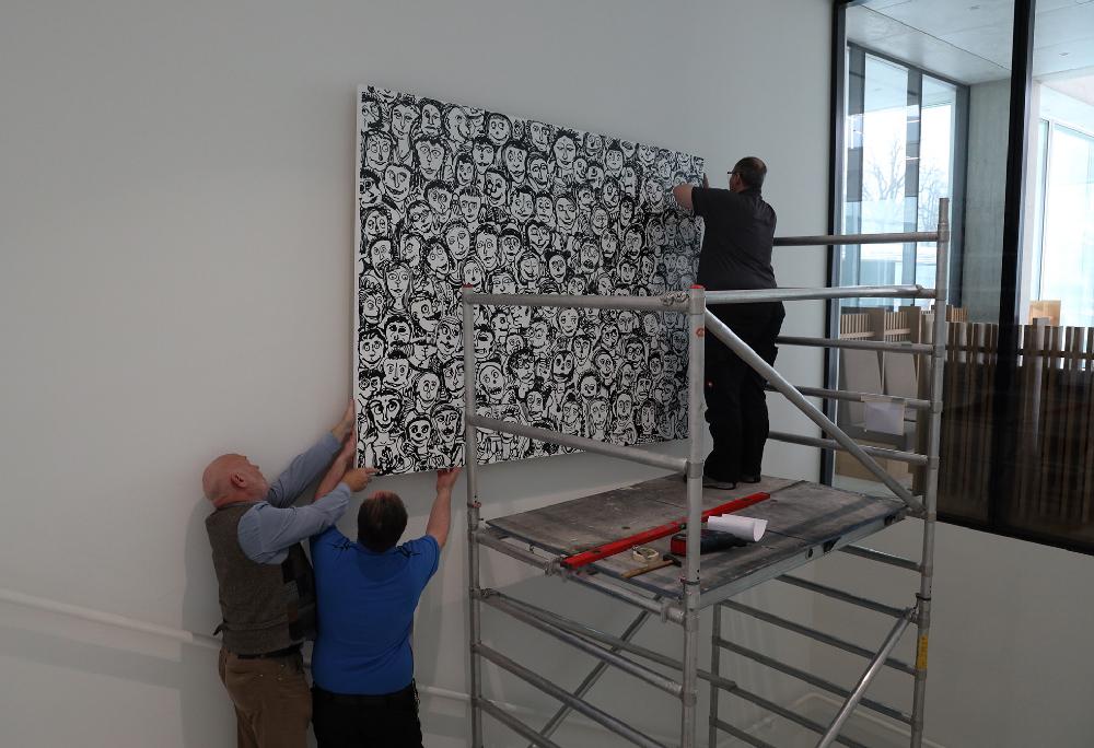 The painting will eventually envelop viewers in the hallway from two opposite walls. Smaller, framed sketches on the wall add another layer.