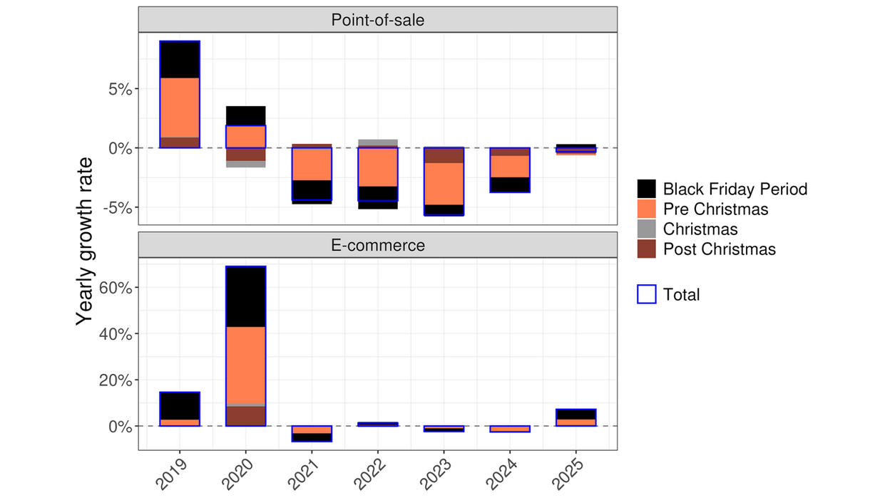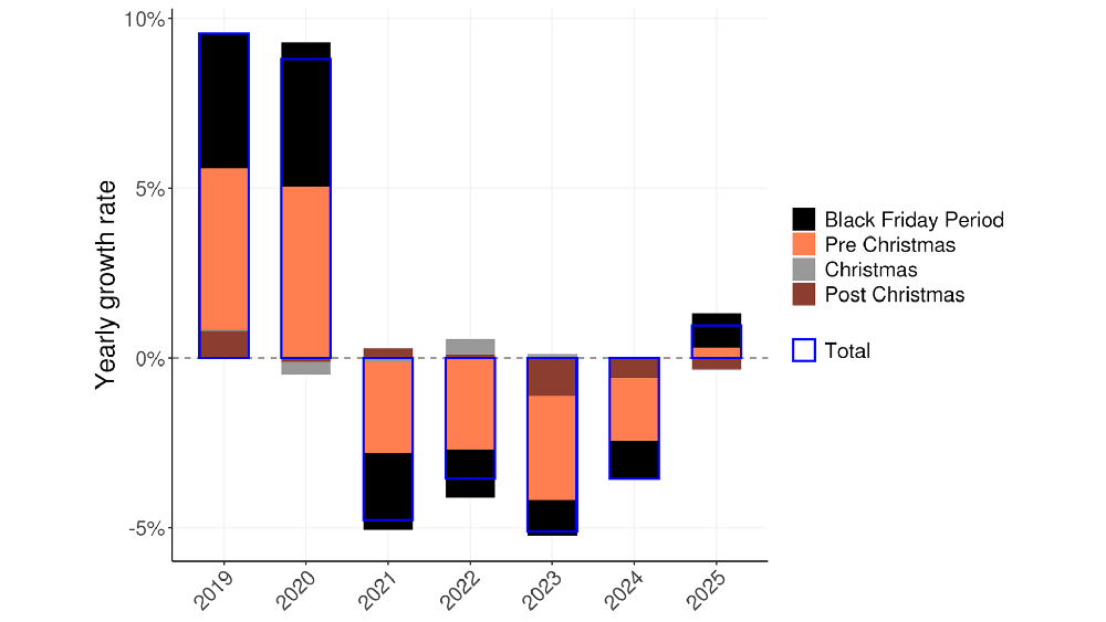 A review of the Christmas season shows that the Black Friday period in 2025 saw slightly higher spending than in the previous year. After several years of decline, this boost was enough to make spending growth over the entire Christmas season slightly positive again.