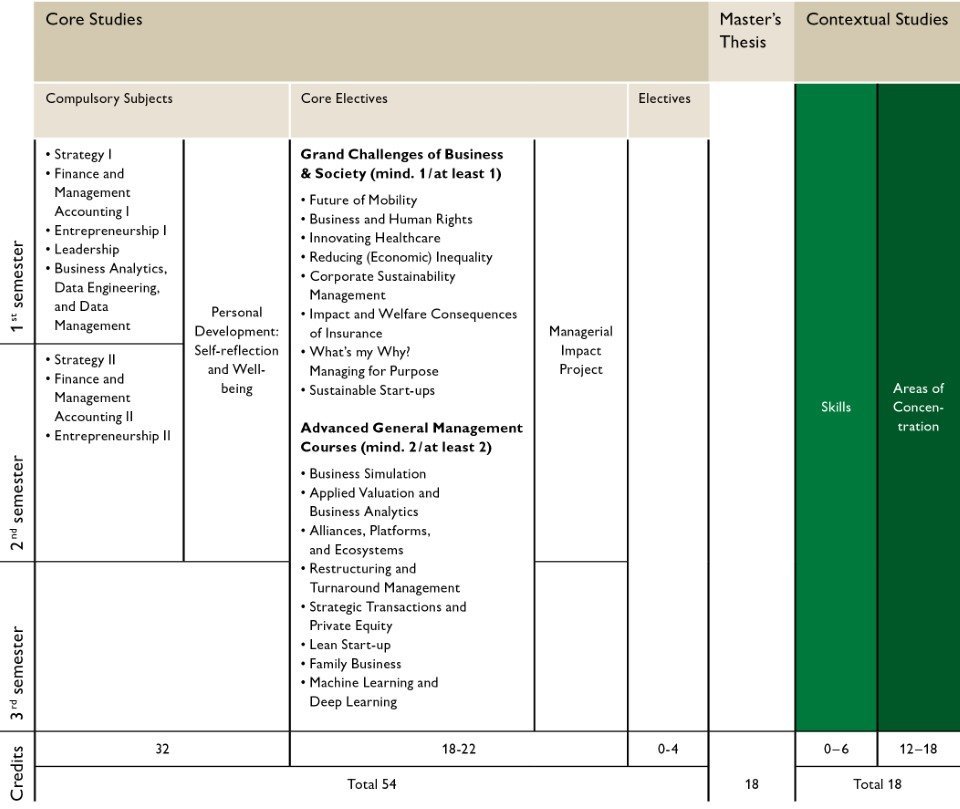 Ihr Fachstudium besteht aus einem Pflichtbereich und einem Pflichtwahlbereich (Advanced General Management Courses, Managerial Impact Project, Grand Challenges of Business and Society), die wir im Folgenden gesondert vorstellen. Die Pflichtfächer geben Ihnen ein klares Profil, das für rekrutierende Unternehmen, aber auch für die Unternehmensnachfolge oder die Gründung eines eigenen Unternehmens wie geschaffen ist. In zwei Semestern erhalten Sie eine einzigartige akademische Ausbildung in unseren drei Kerndisziplinen Entrepreneurship, Strategie sowie Finance & Management Accounting.
