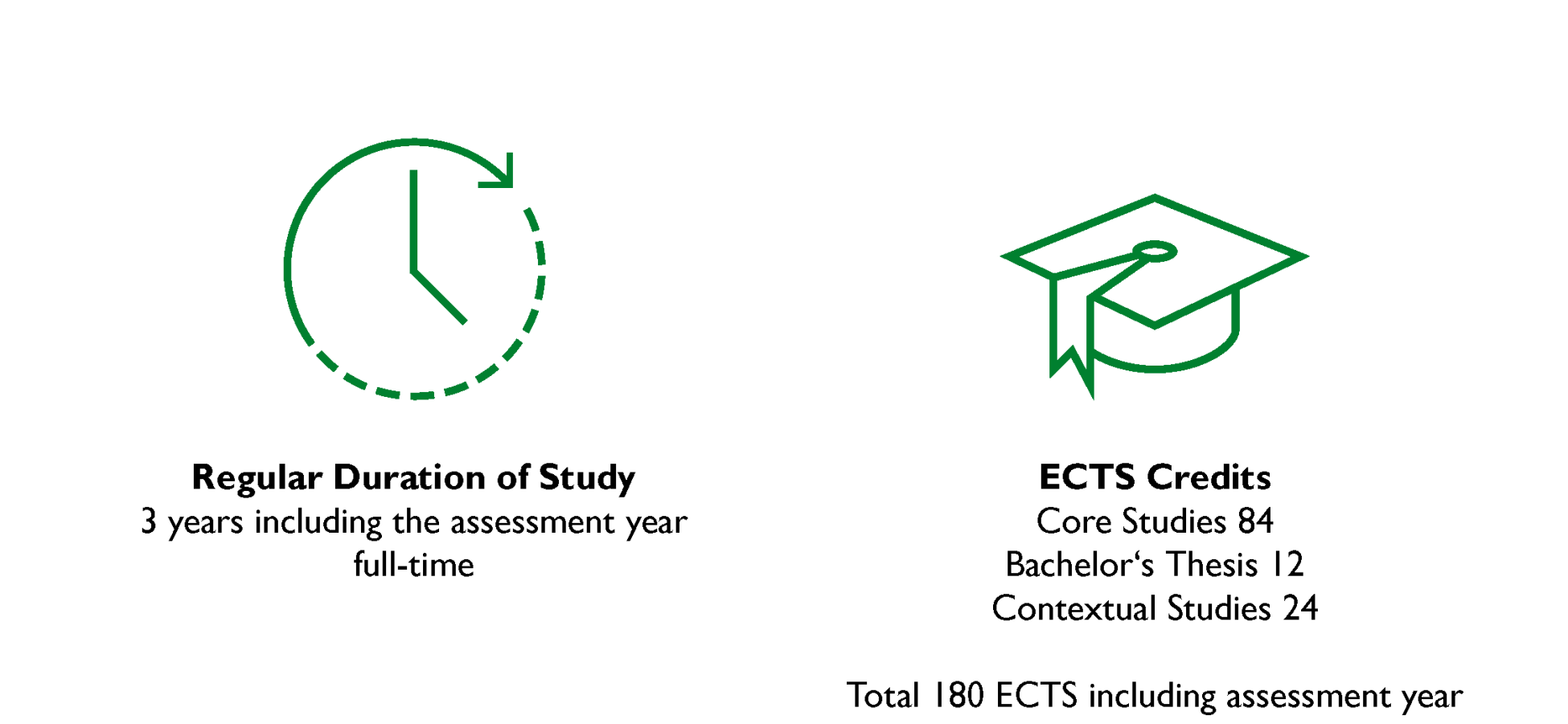 The Bachelor's programme includes of core studies (96 ECTS) and contextual studies (24 ECTS). Including the assessment year, the programme consists of a total of 180 ECTS credits.