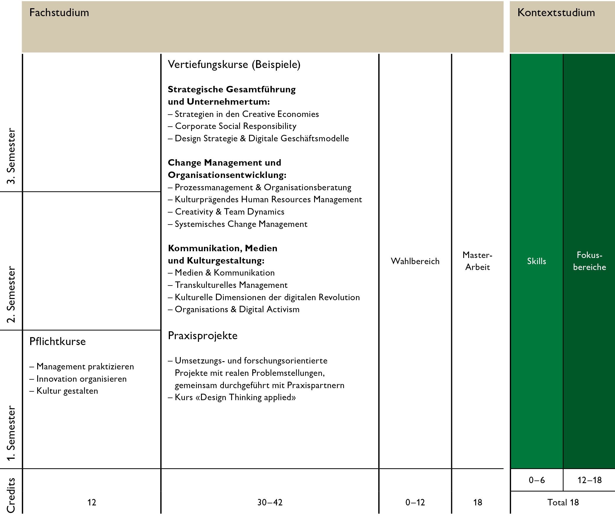 • Die Vertiefungskurse (meist je 4 ECTS) sind thematisch an strategischer Gesamtführung und Unternehmertum, Change Management und Organisationsentwicklung, sowie Kommunikation, Medien und Kulturgestaltung orientiert. Didaktisch sind alle Kurse interaktiv, wissenschaftlich fundiert und praxisorientiert – Vorlesungen sucht man auch hier vergebens!
